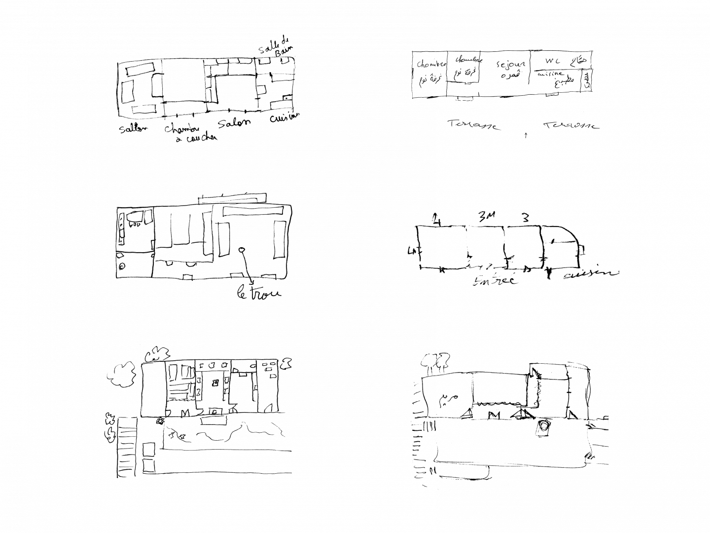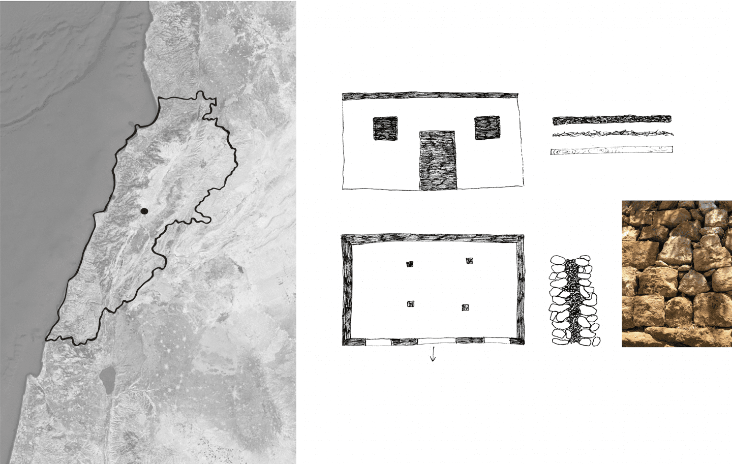Maison élémentaire : élévation, plan, composition du toit et des murs, pierres d’origine.