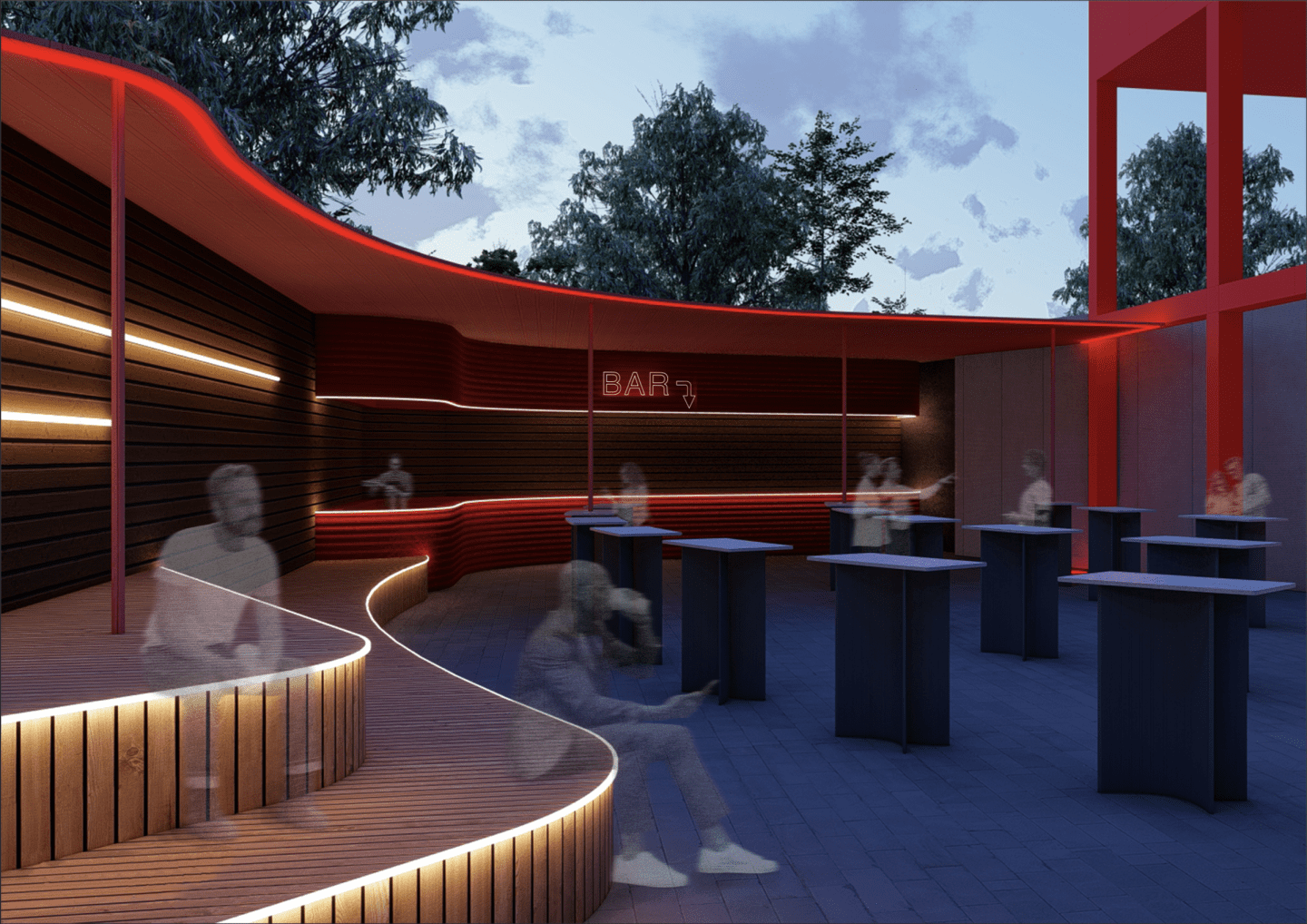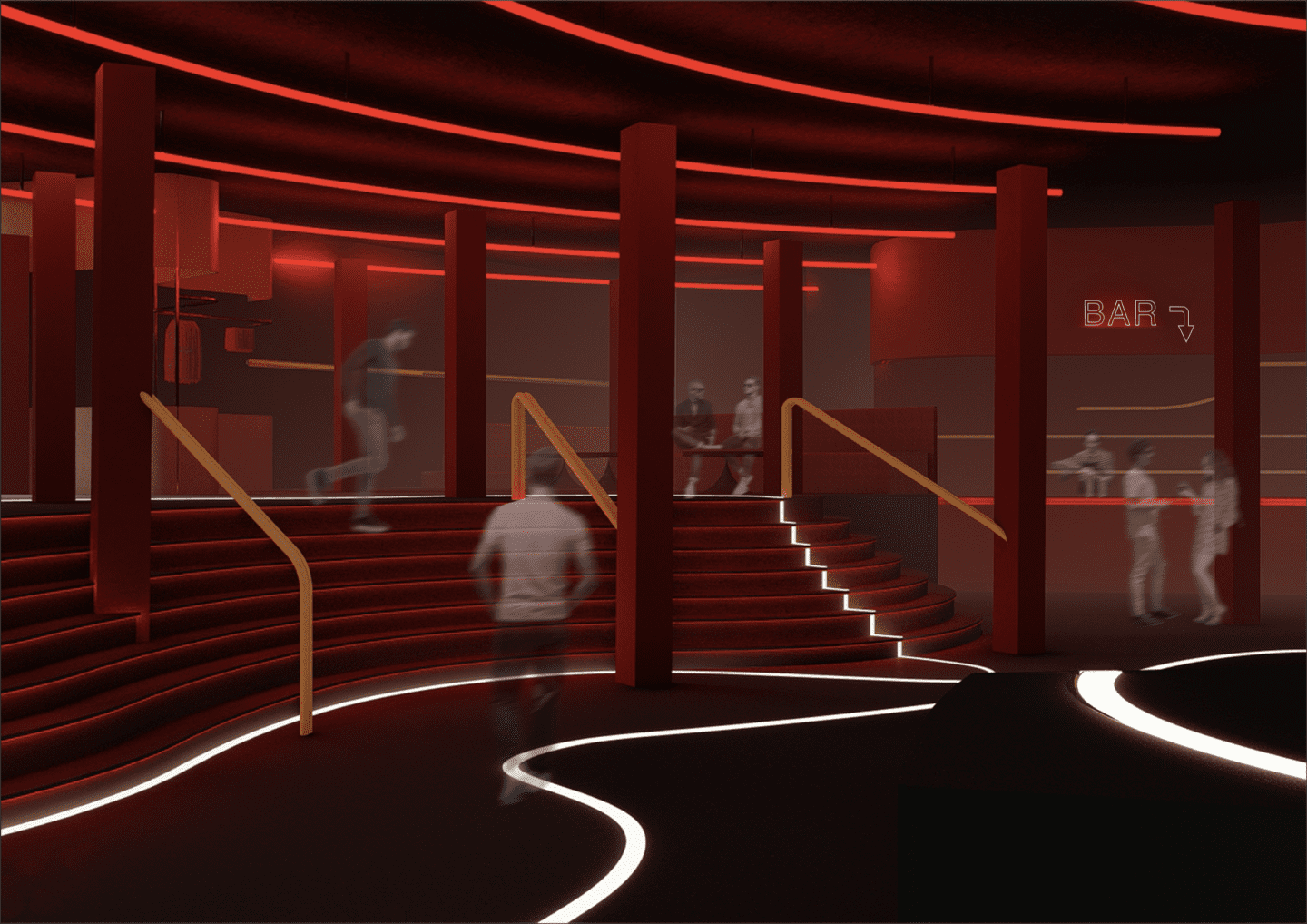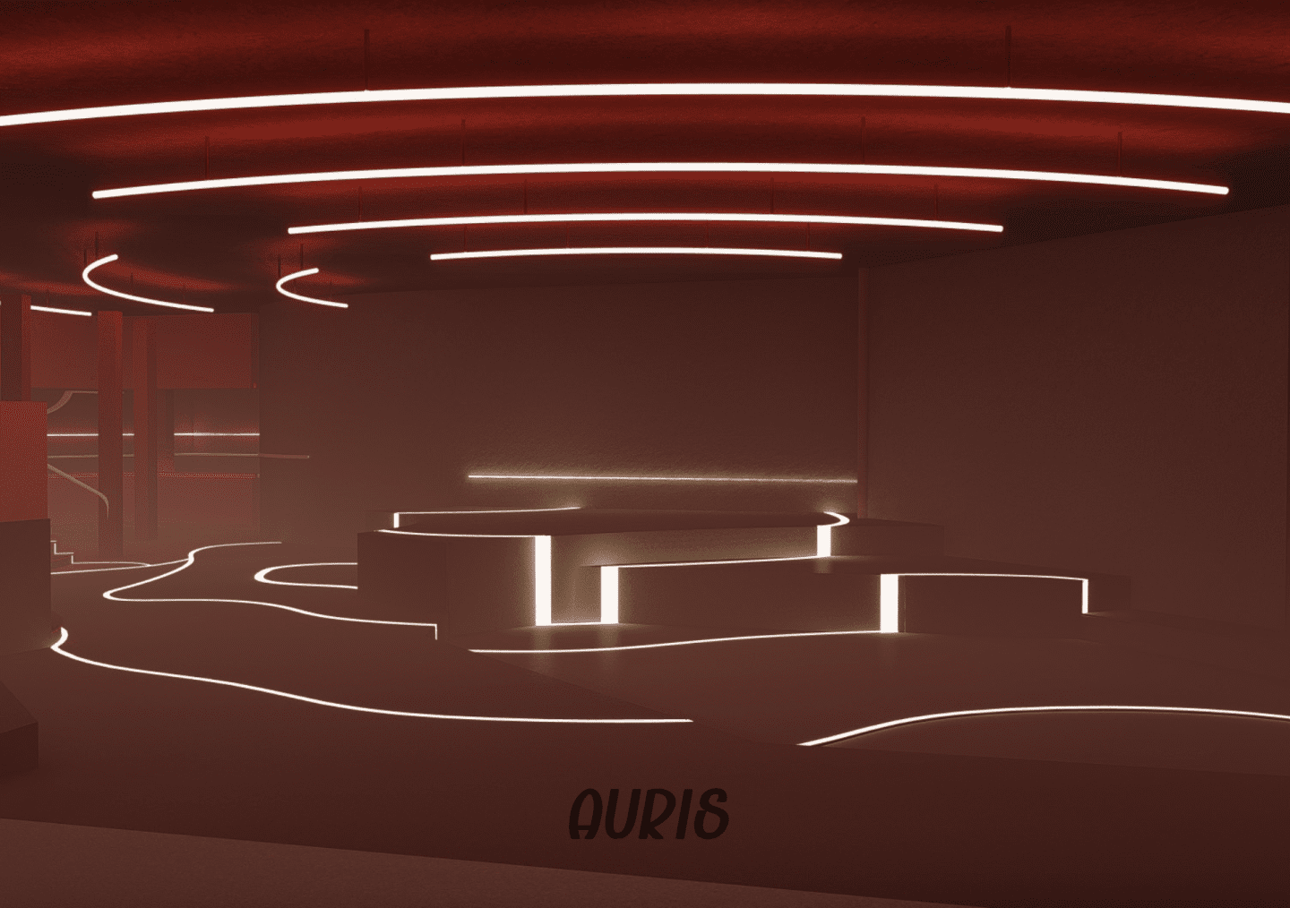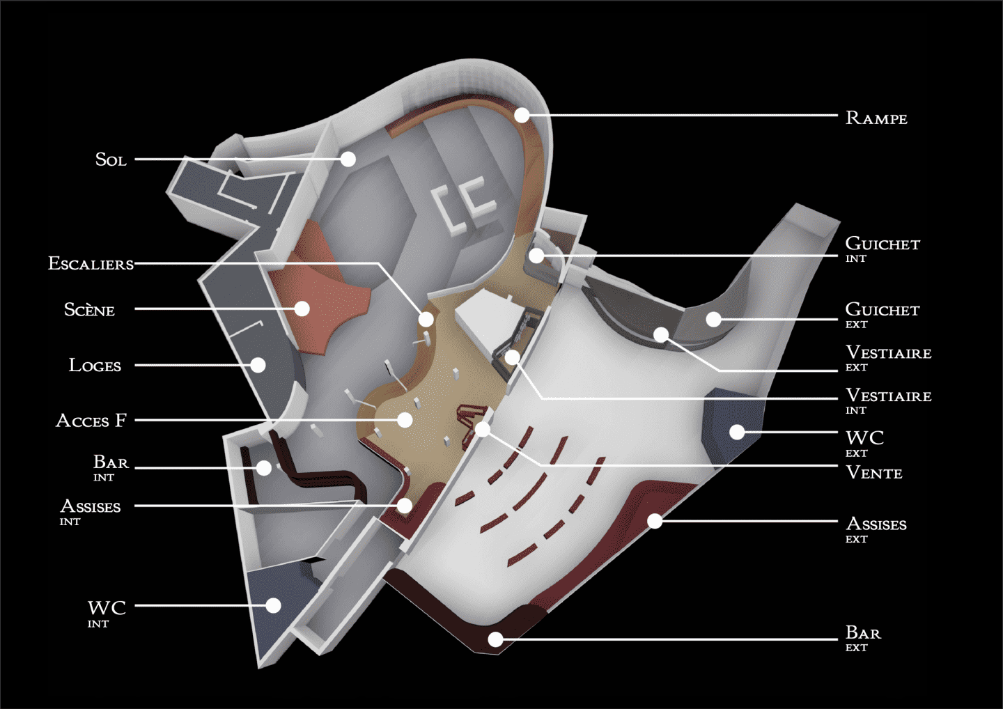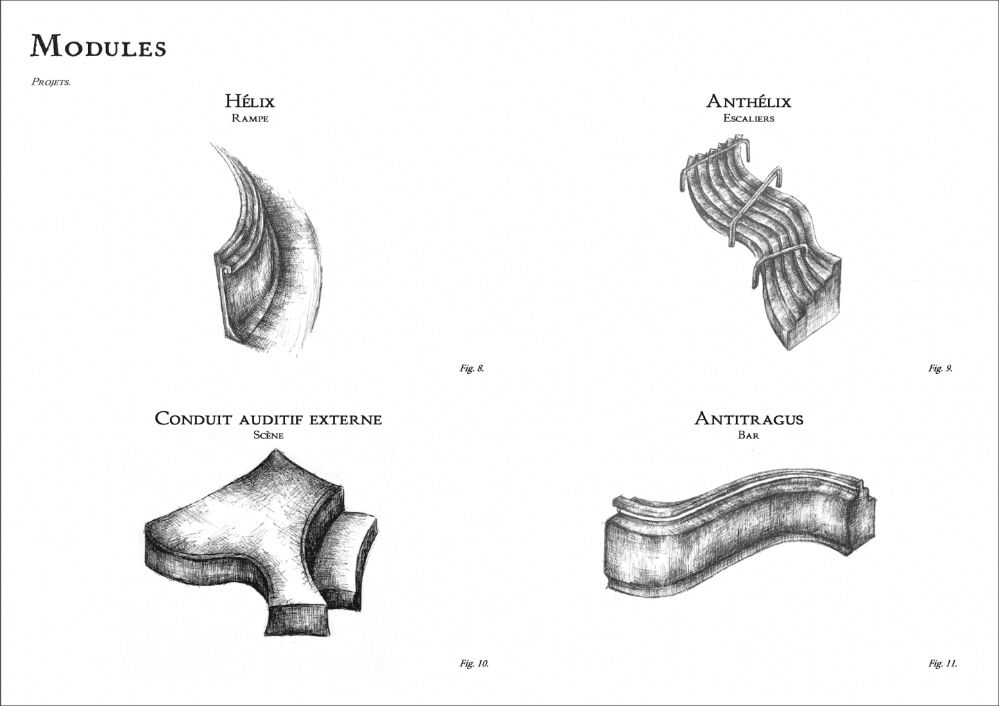 Our project is inspired by the ear. By analysing its shape (namely the outer ear) and the way it works, we can match the common areas to this human organ and the plan of Le Trabendo. Our idea is to highlight its initial ear shape, by working on precise areas of the venue in order to suggest the idea of the ear to visitors. This choice allows us to create unity within Le Trabendo and to work in a simple way, rooted in a venue that already functions well. We also aim to give Le Trabendo a new visual identity more in line with our intentions, namely with the interplay of light in the room, which allow the atmosphere to be adapted. Light and sound flow from the stage regressively towards the exterior of Le Trabendo.