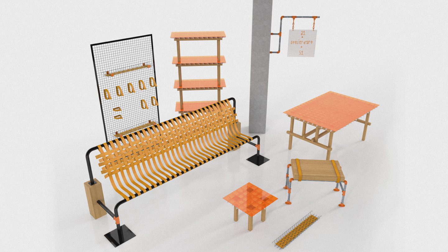 Avec une approche plastique je suis venue façonner, modeler les éléments les uns aux autres. A partir d’éléments bruts, et d’éléments rapportés, j’ai pensé une nouvelle identité, un mobilier pour les différents usages à la cité radieuse.