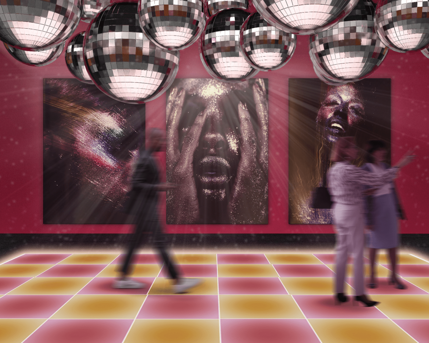 Le mouvement Disco est le moyen pour les populations de s’affranchir de ce climat social et urbain tendu, le temps d’une soirée. La seconde partie de l’exposition s’imprègne des codes de la discothèque avec des couleurs vives et une bande son de titres de l’époque. Les grandes figures du mouvement Disco trônent dans l’espace.