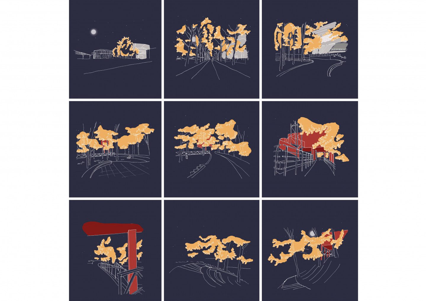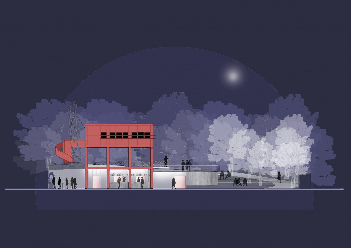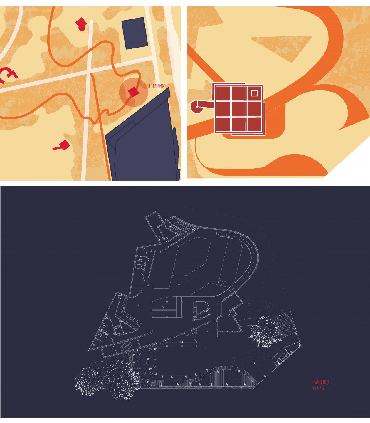 Nous nous sommes inspirées du dessin organique formé par les massifs d’arbres et les chemins. Le projet est alors pensé comme un prolongement du chemin sinueux qui mène au Trabendo. Les formes, lignes et matières du projet renouent avec le contexte organique du parc tout en dialoguant avec l’esthétique industrielle de la folie.