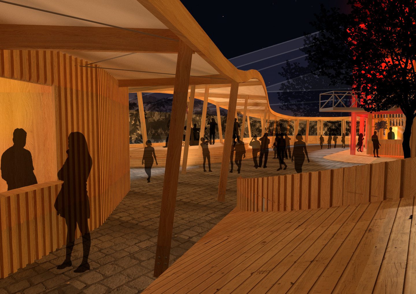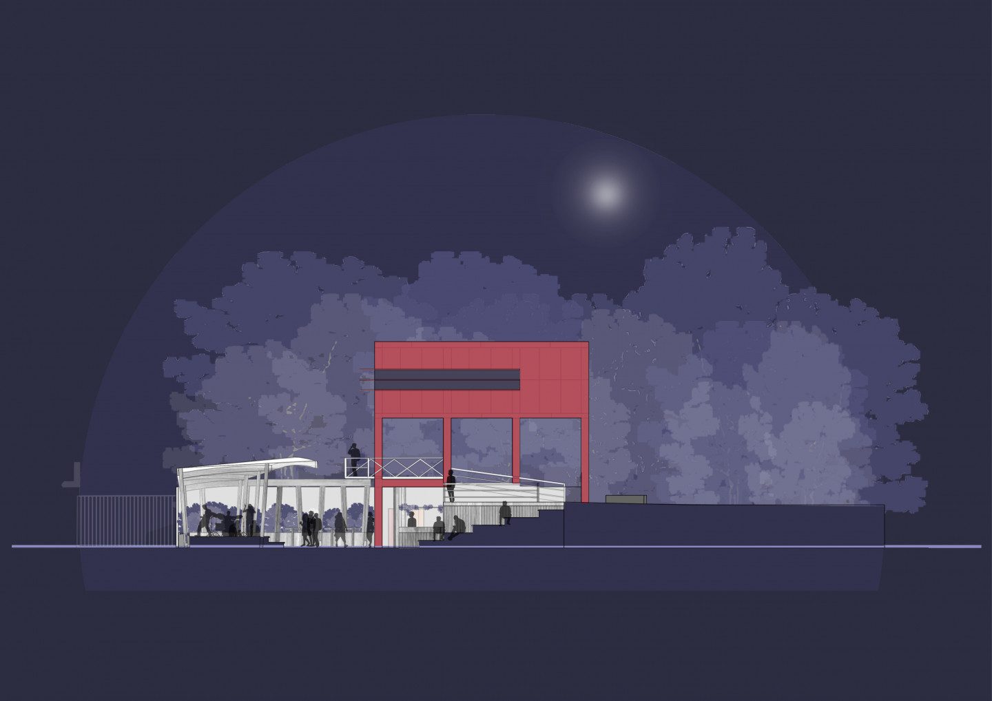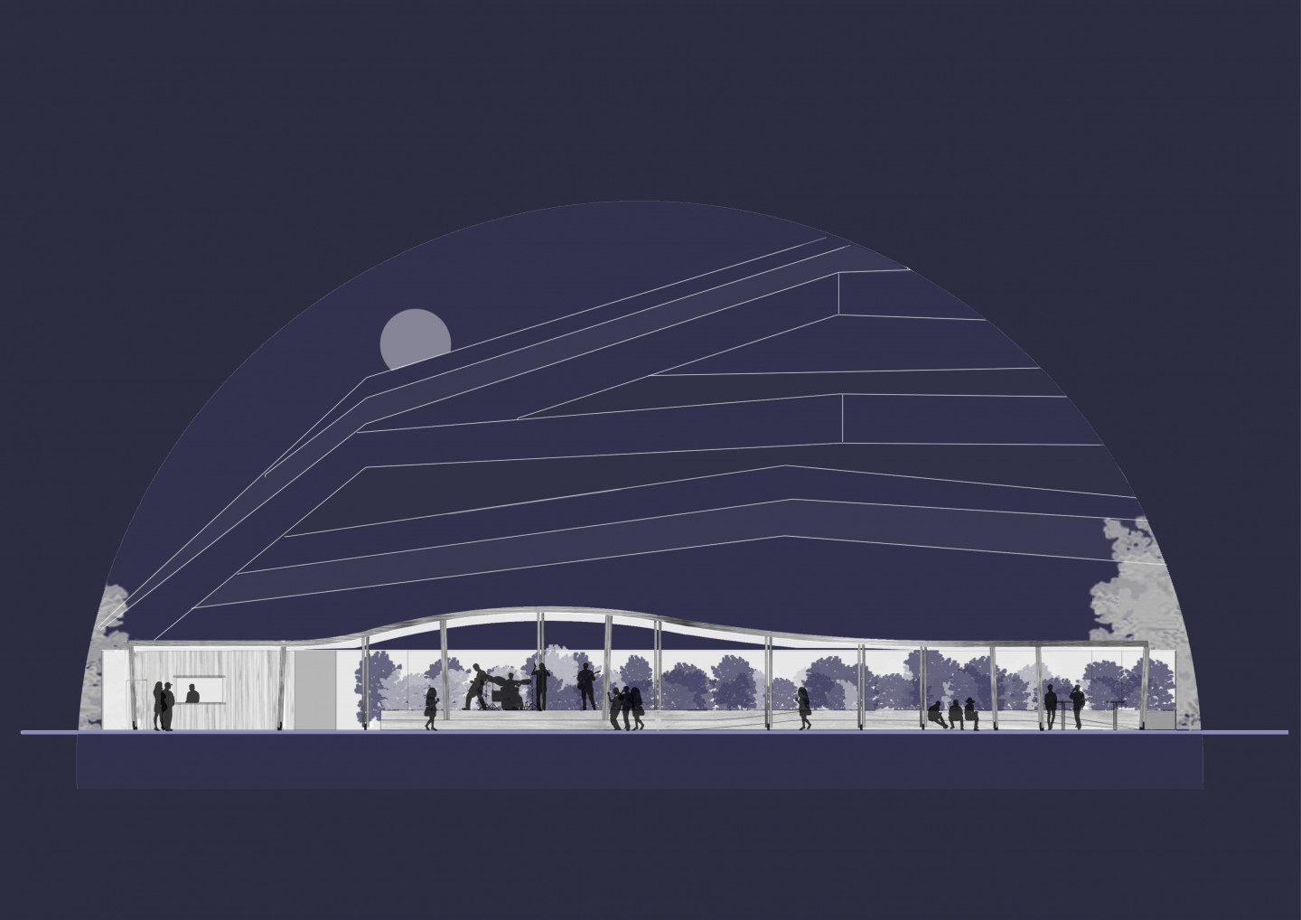 Dès son arrivée, le visiteur est accueilli par la toiture sous laquelle se déploient les activités extérieures. Après le guichet, la toiture s’élève et s’élargit offrant ainsi un espace généreux à la scène. Cette toiture fine et légère ondule au-dessus des visiteurs, la philharmonie devient le décor de second plan de cette ligne dansante.