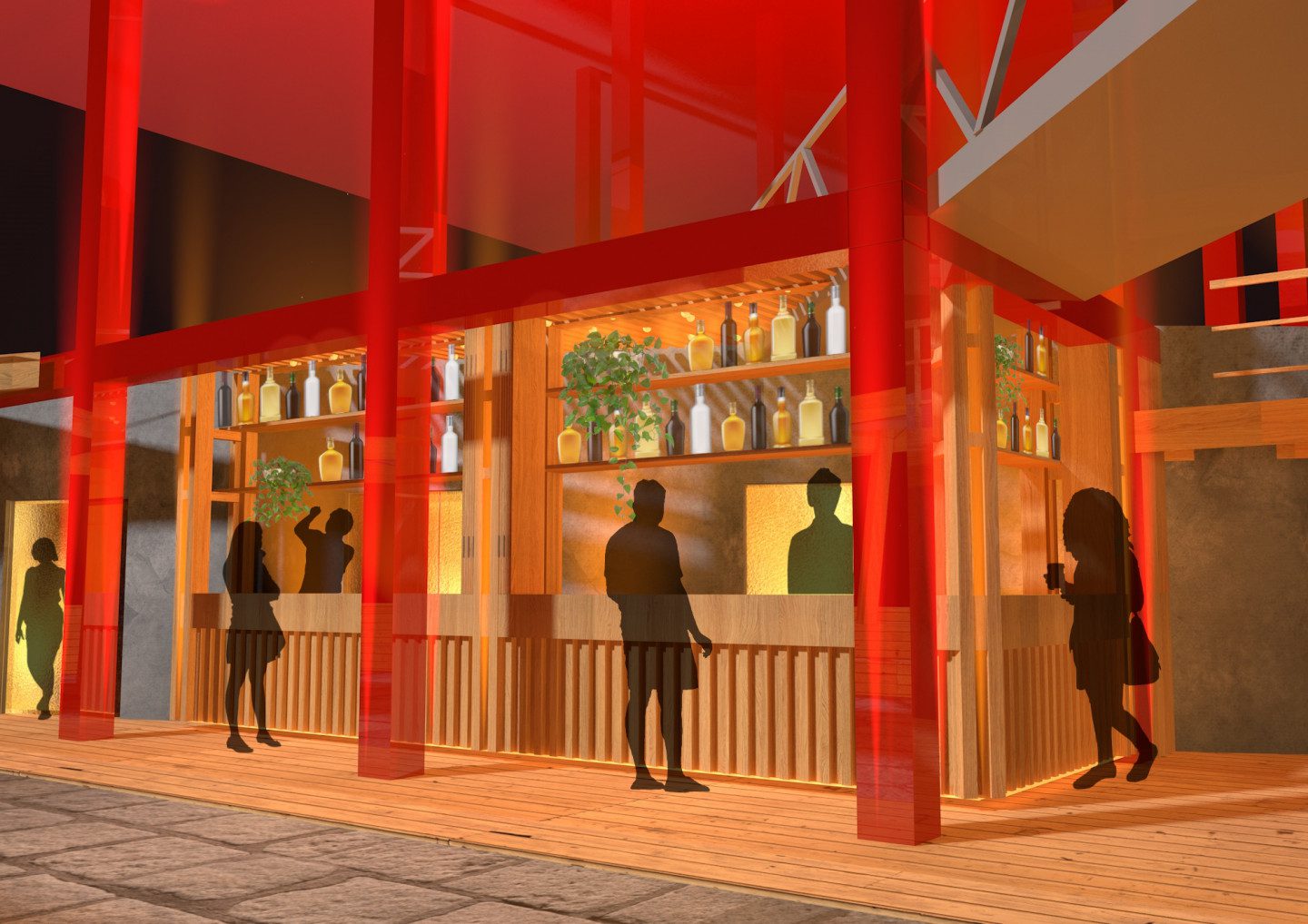 Installé au cœur de la folie, le bar lui permet de retrouver toute sa splendeur et sa place centrale en l’animant de vie et de lumières.