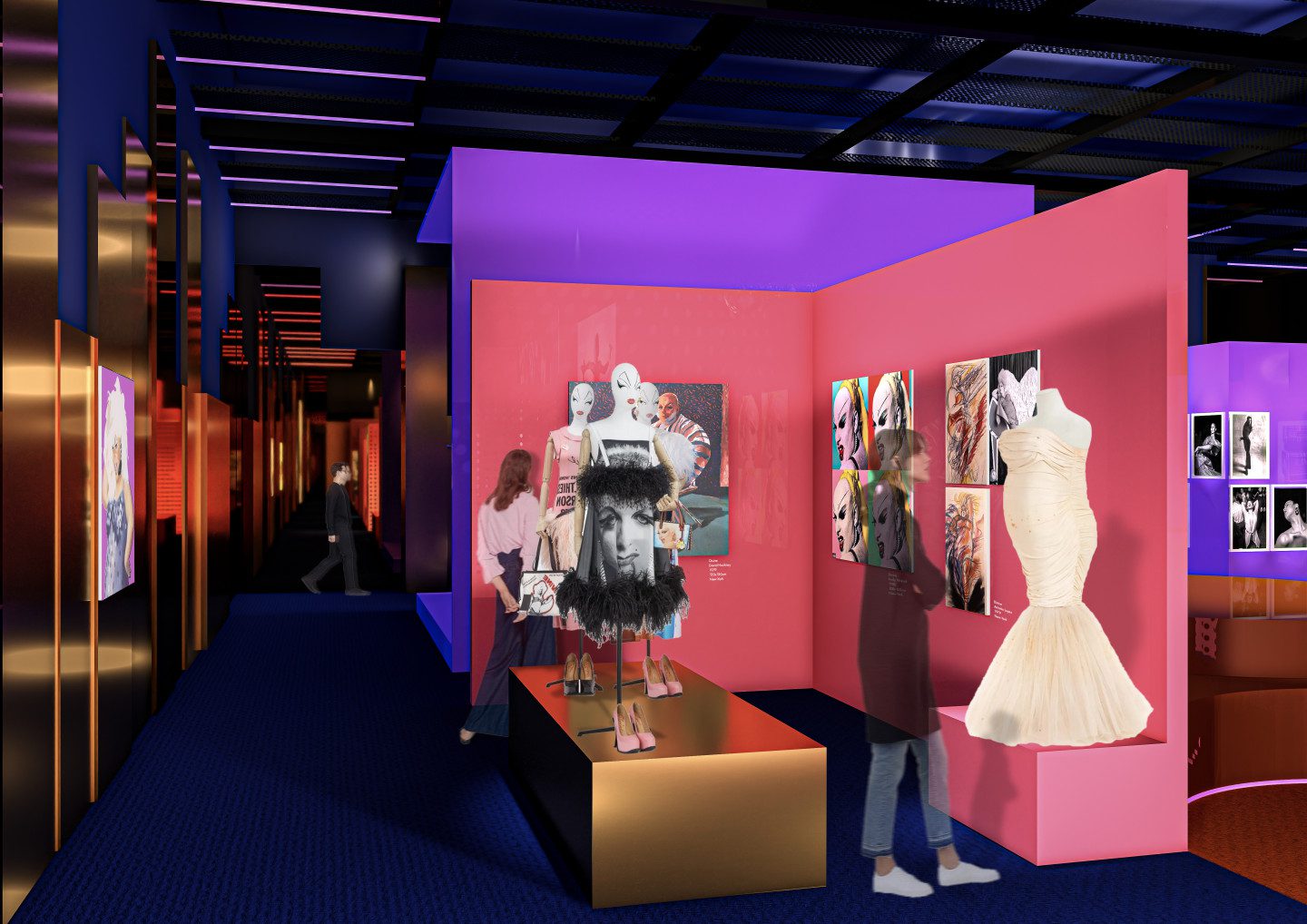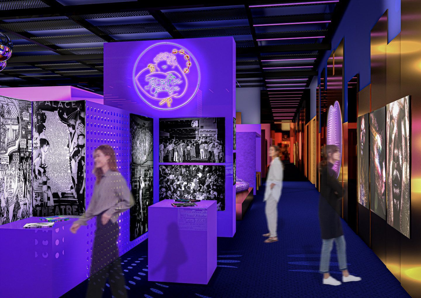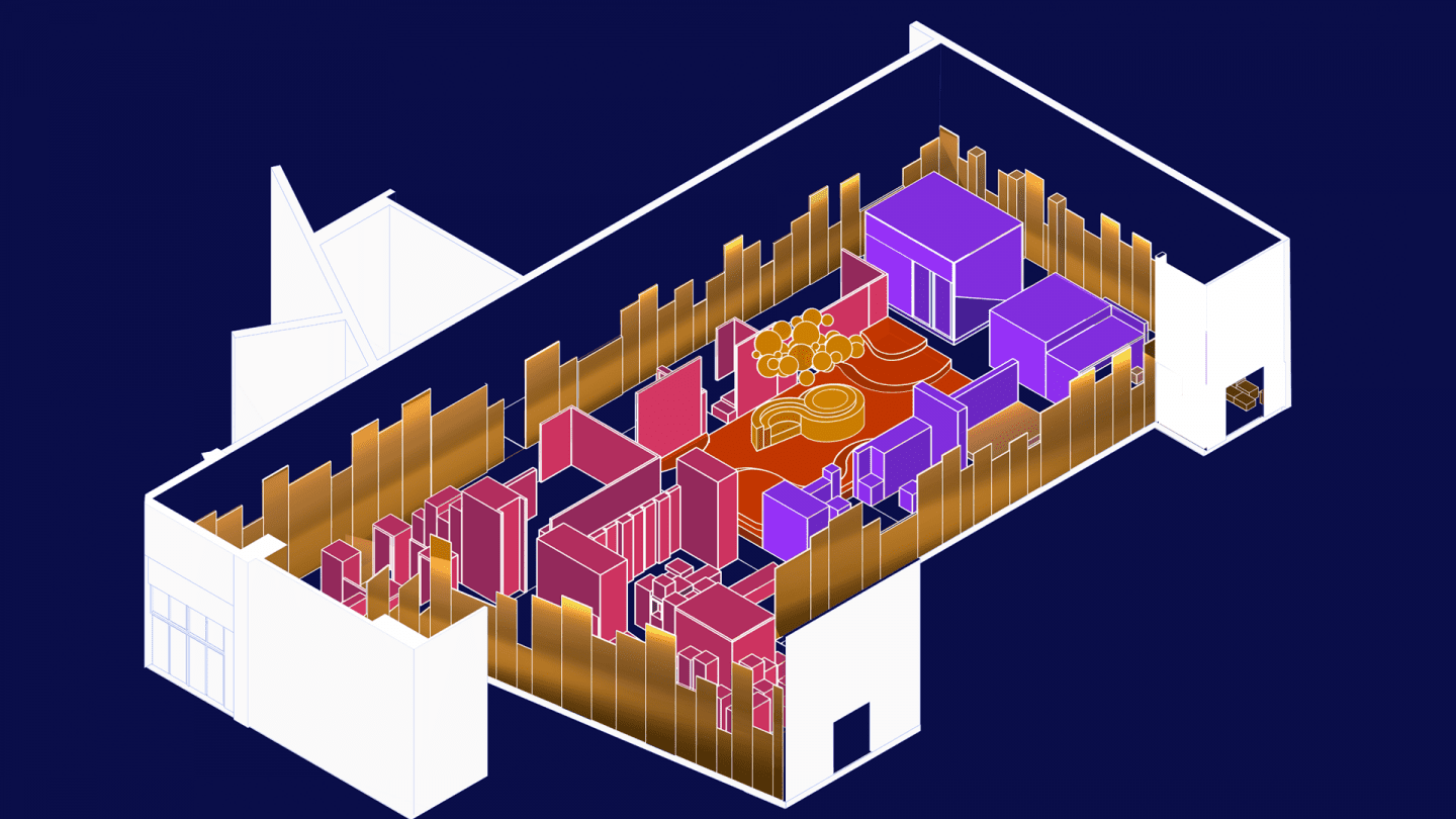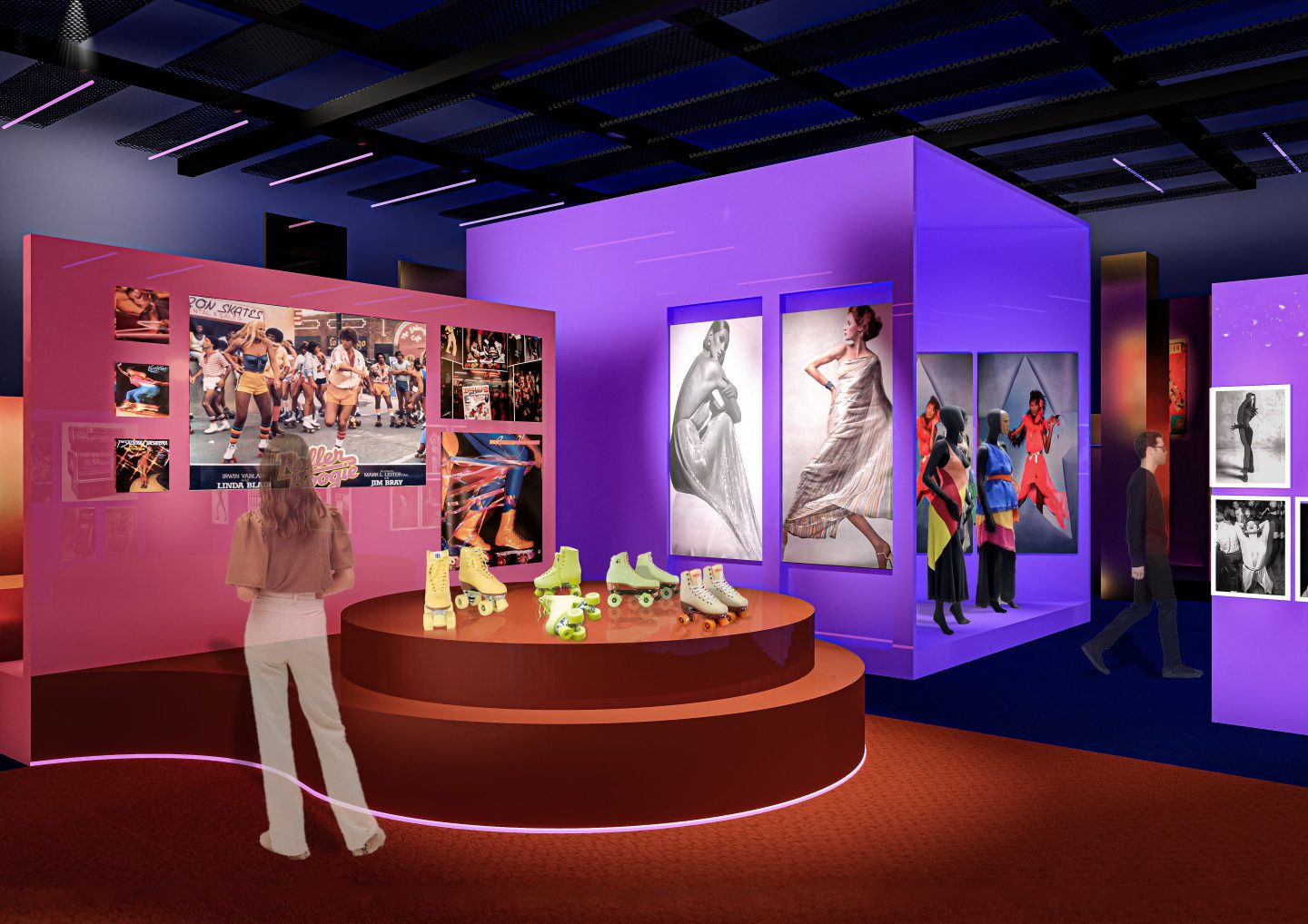 “The city is a party” serves as the guiding principle for the scenography of the Disco exhibition that will be held at the Philharmonie de Paris. Inspired by urban density, it creates combinations of height, perspective and hangings, while allowing visitors to explore as they please. Coloured pathways offer signposting between all the themes of the exhibition and immerse visitors in the world of disco, from its history to its legacy, a parallel that is omnipresent throughout the exhibition.