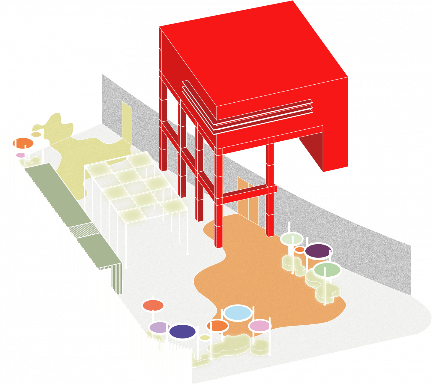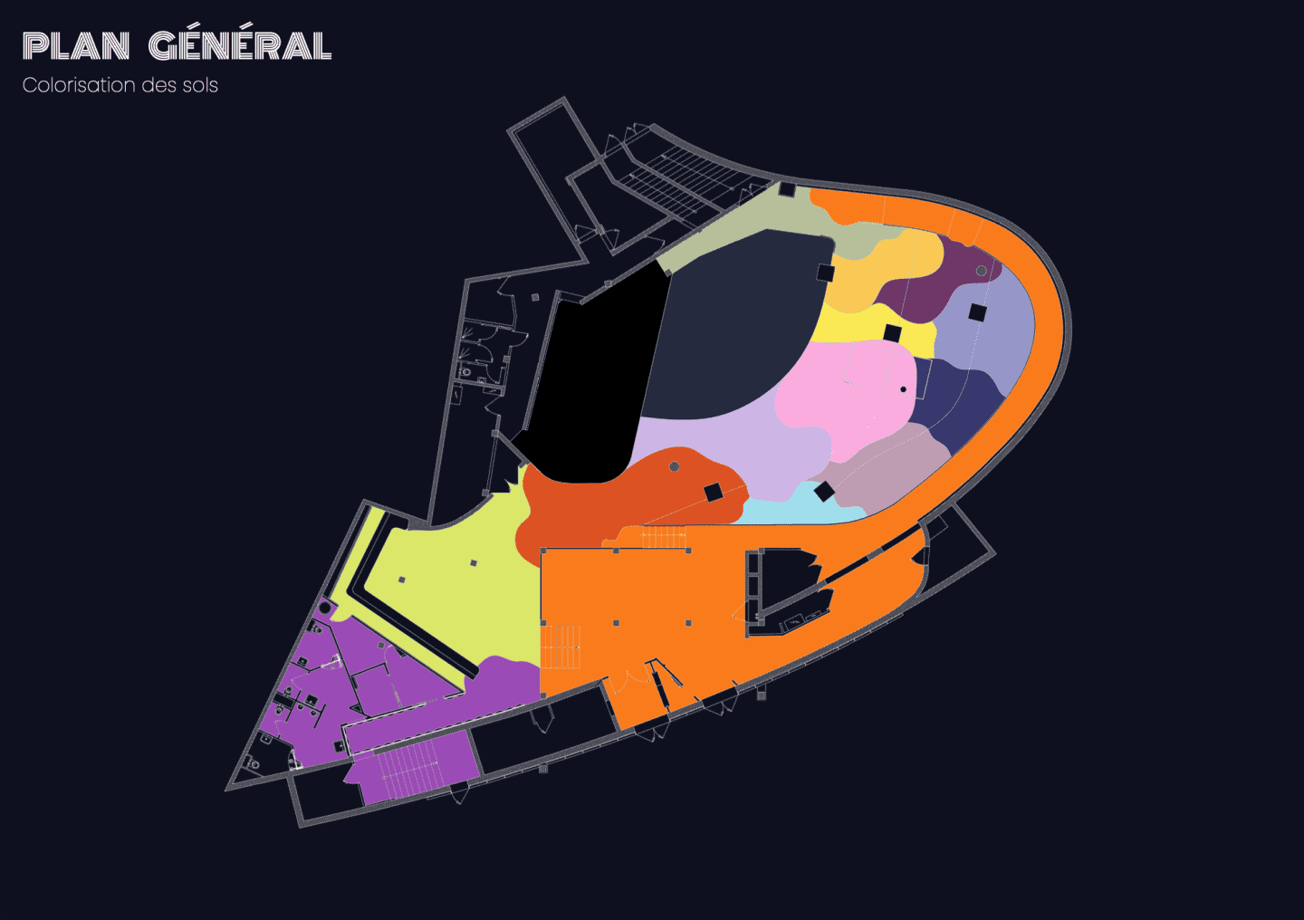 Nous avons effectué un travail de couleurs et de matières au niveau des sols, qui vient retranscrire la vibration des sons qui émanent de la boite de nuit. Ces couleurs découlent dans les différents espaces du Trabendo pour arriver jusqu’à la terrasse que nous avons pensé comme une continuité avec l’espace intérieur