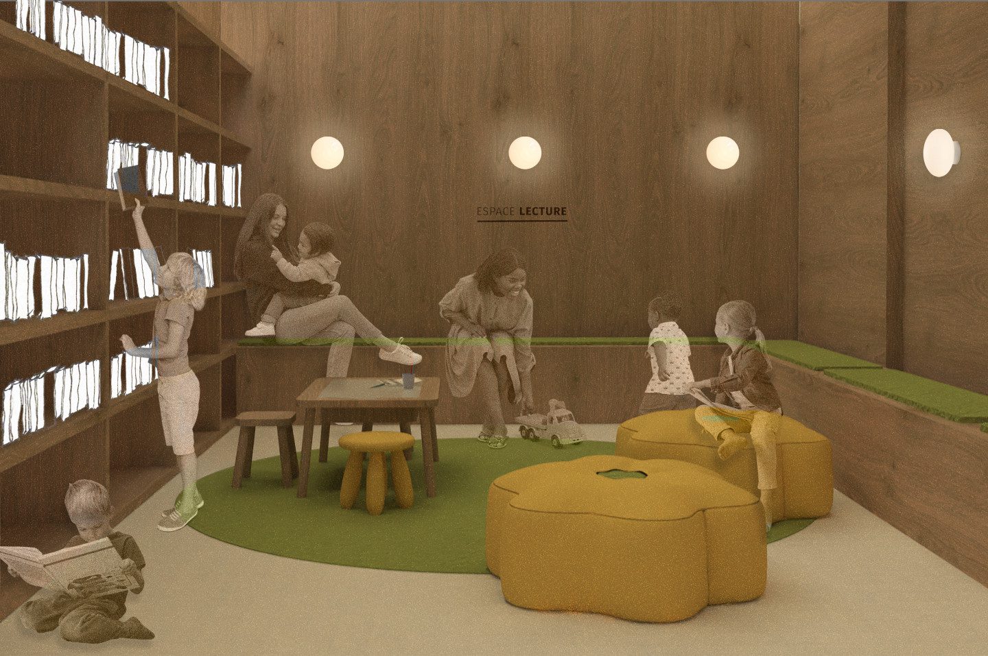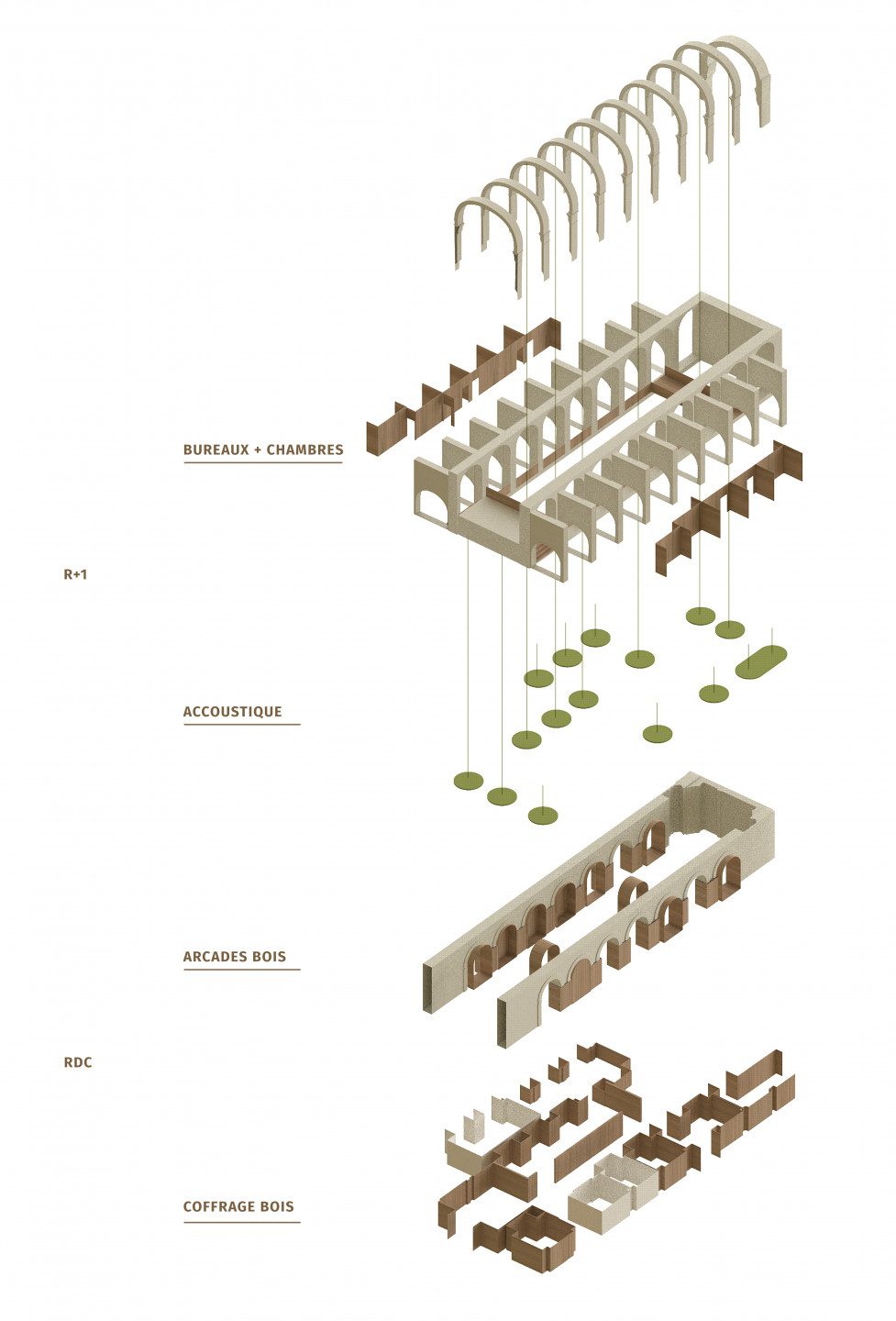 J’ai pris en compte la notion réversibilité du bâtiment dans mon aménagement intérieur en coffrant partiellement de bois les parties basses des murs qui pourront être enlevés à n’importe quel moment pour tout autre utilisation du bâtiment.