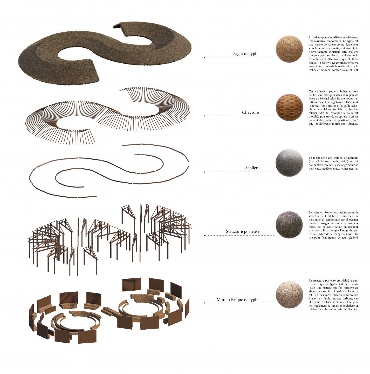 Au sein de ce projet cohabitent trois matières prédominantes : la terre, le typha et le rônier. Un dialogue entre des matières et des savoir-faire locaux.