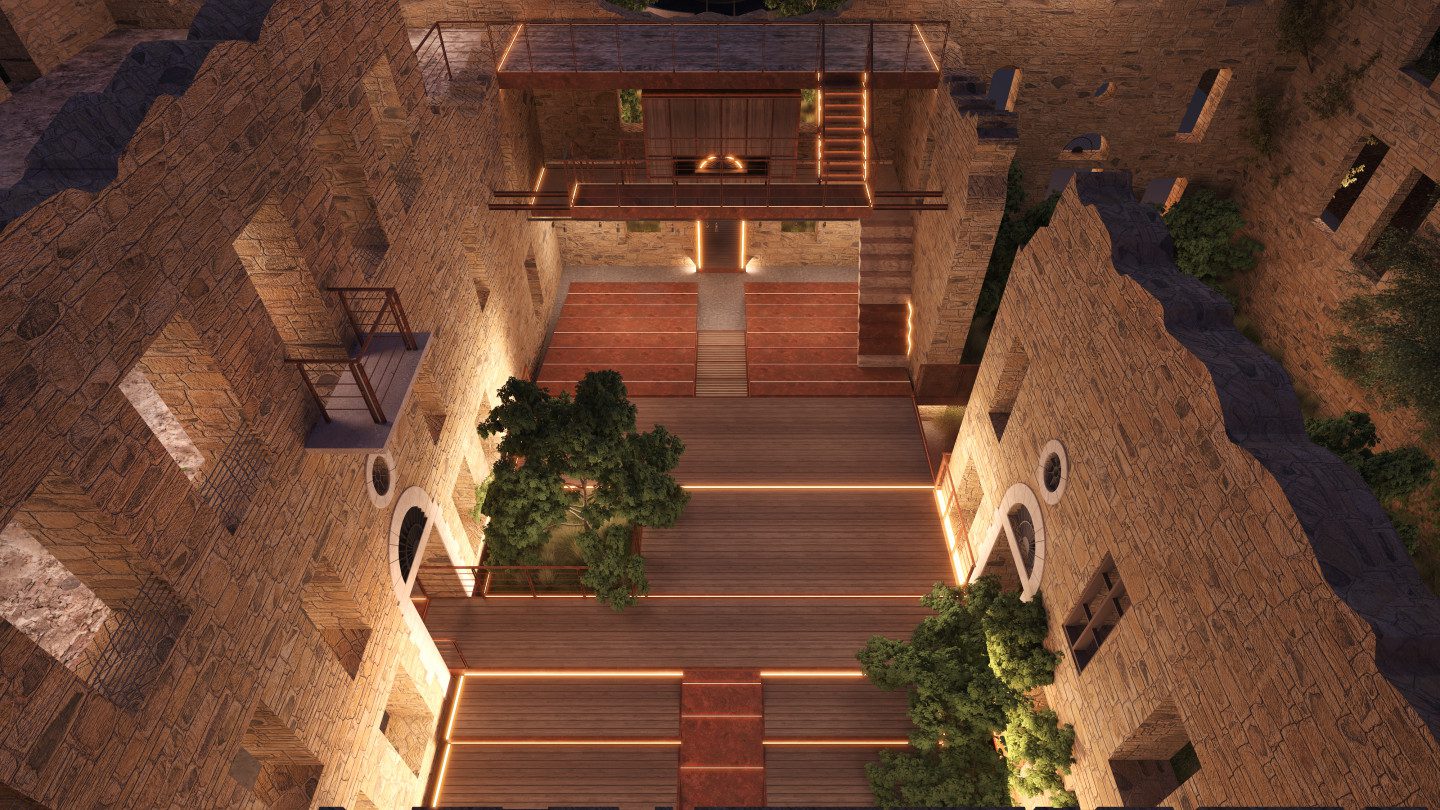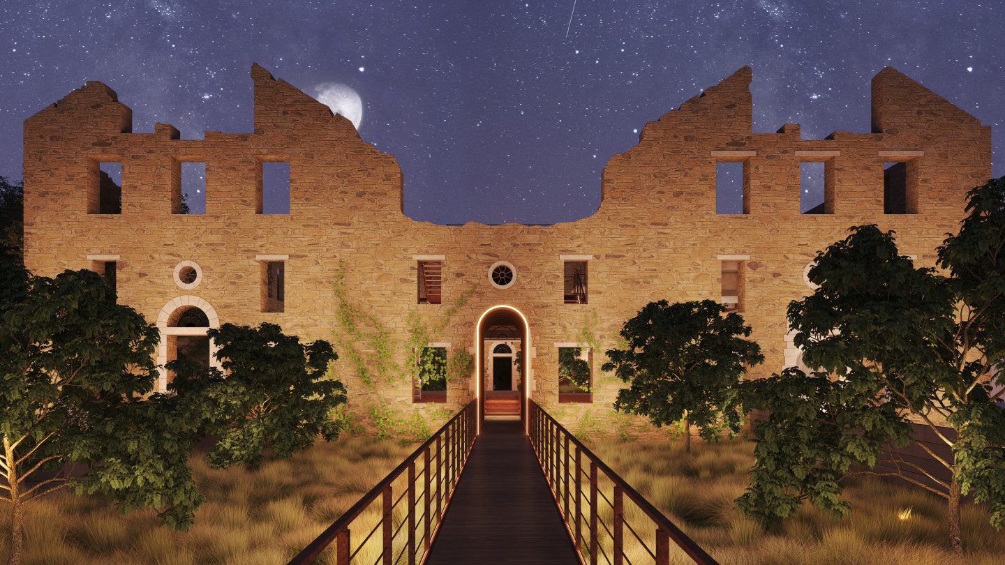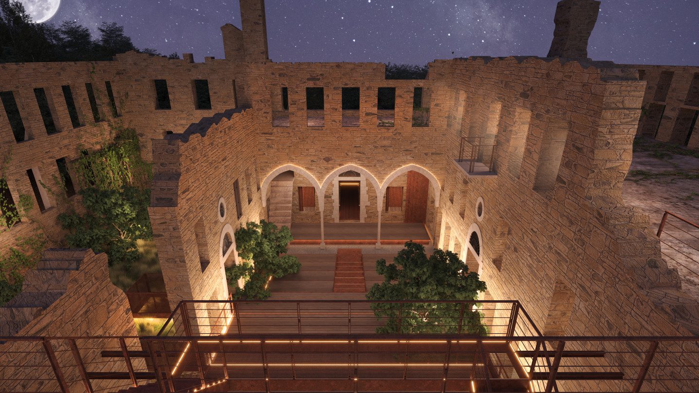 La lumière joue un rôle important, elle dessine le lieu, les trois arcades, les entrées, elle rase les murs de pierres et fait ressortir toute leur beauté. La structure, elle aussi est allumée, indiquant ainsi la circulation et les différents espaces créés.