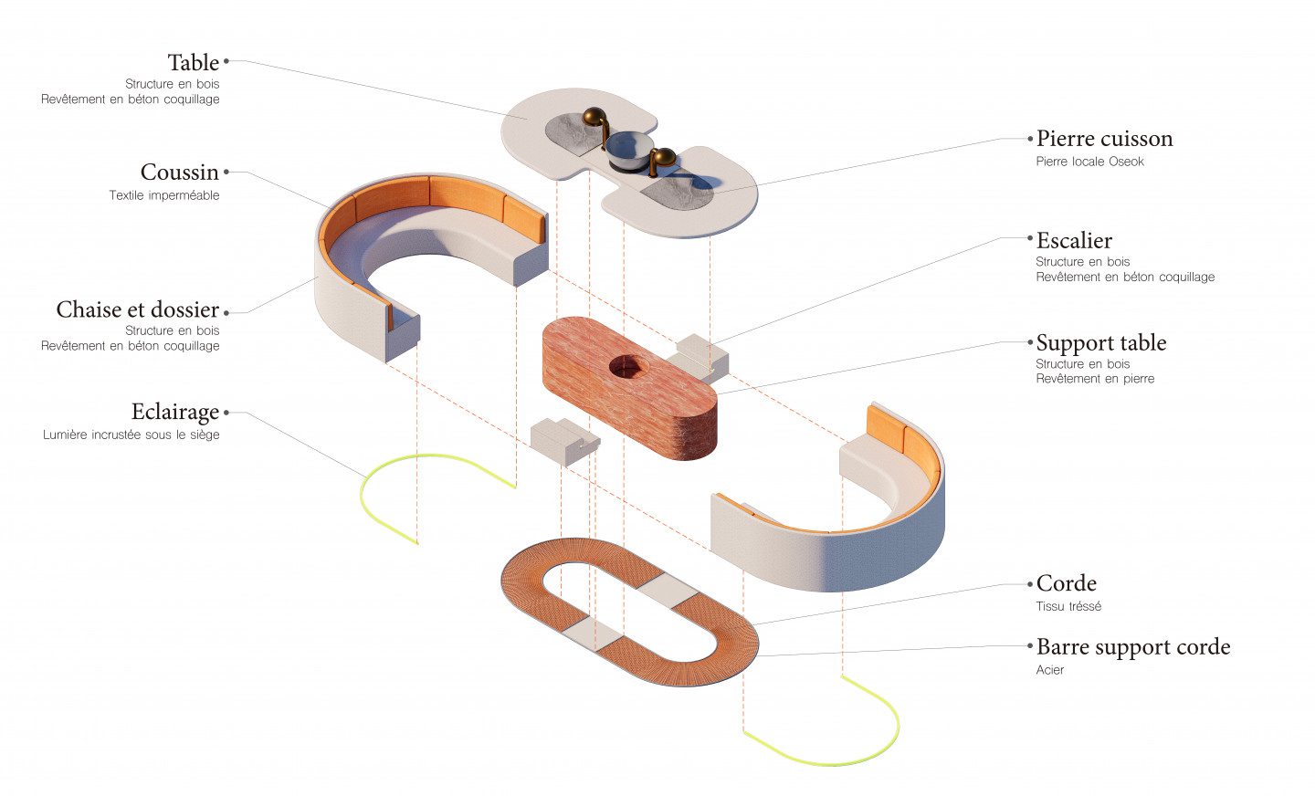 L’espace cuisine et repas serait comme une aire de repos face à la mer, comme des halles en plein air pour déguster des fruits de mer. Il invite les participants à ressentir l’espace proposé. Un sentiment d’unité aussi bien avec les gens qu’avec l’ensemble du paysage.