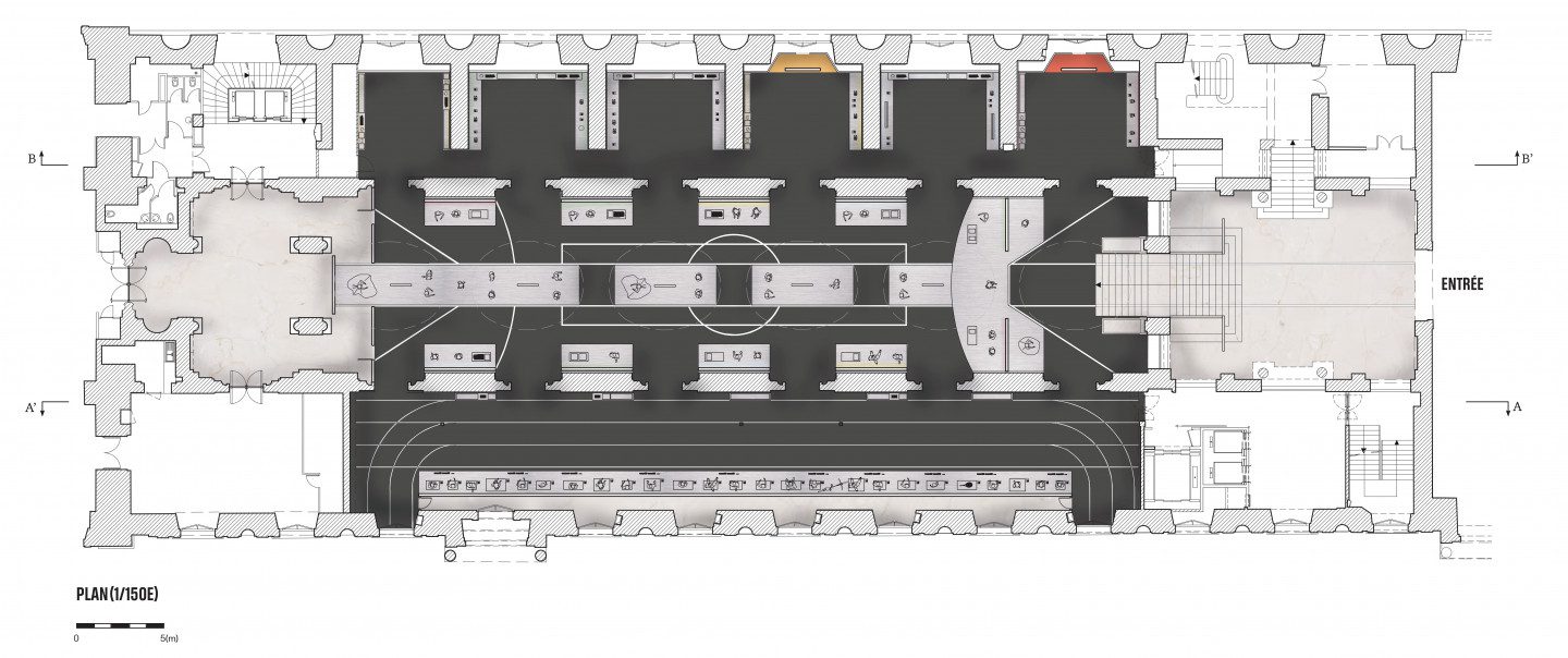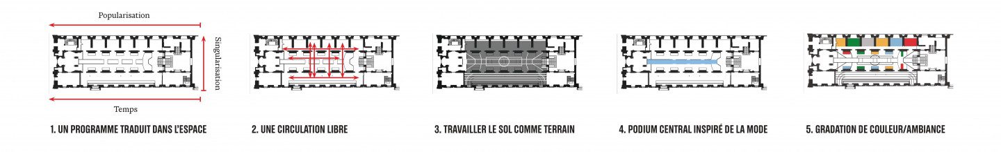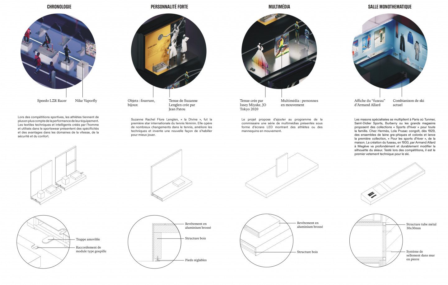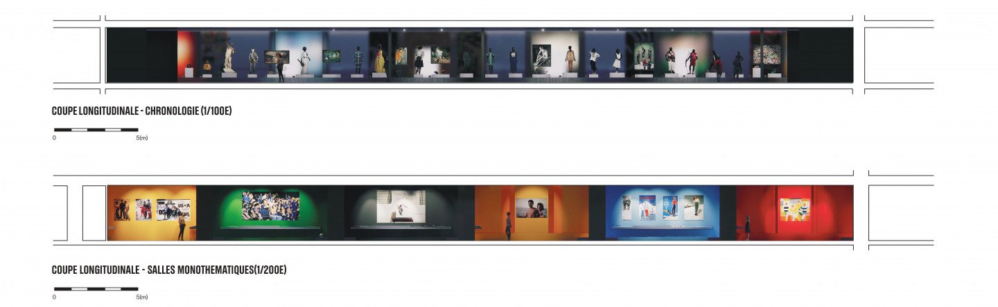 This scenography project is born out of the encounter between the uniqueness of the vast spaces of the Nave at the Musée des Arts Décoratifs and the chronothematic programme of the exhibition “Fashion and Sport: from one podium to another”, organised to mark the 2024 Olympics.The exhibition space, punctuated by lines and podiums, offers a dual interpretation, both through the length of the Nave through a historical chronological organisation, and in a cross-disciplinary way, inviting visitors to discover the unique personalities and sporting communities.The scenography is expressed through an athletics track, a fashion show and monothematic rooms. It enables visitors to compare the connections between clothing and sporting practices within a non-linear route.