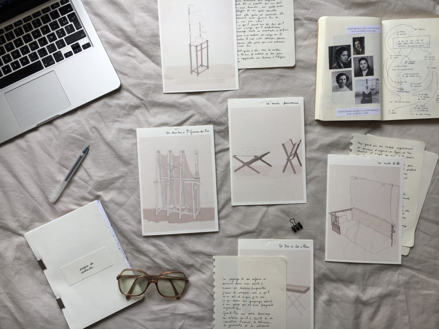 Recherches, croquis, interviews de mon grand-père qui ont nourri ma démarche.