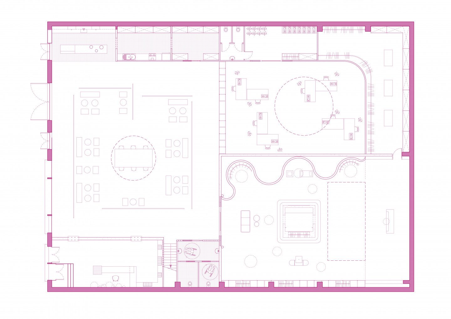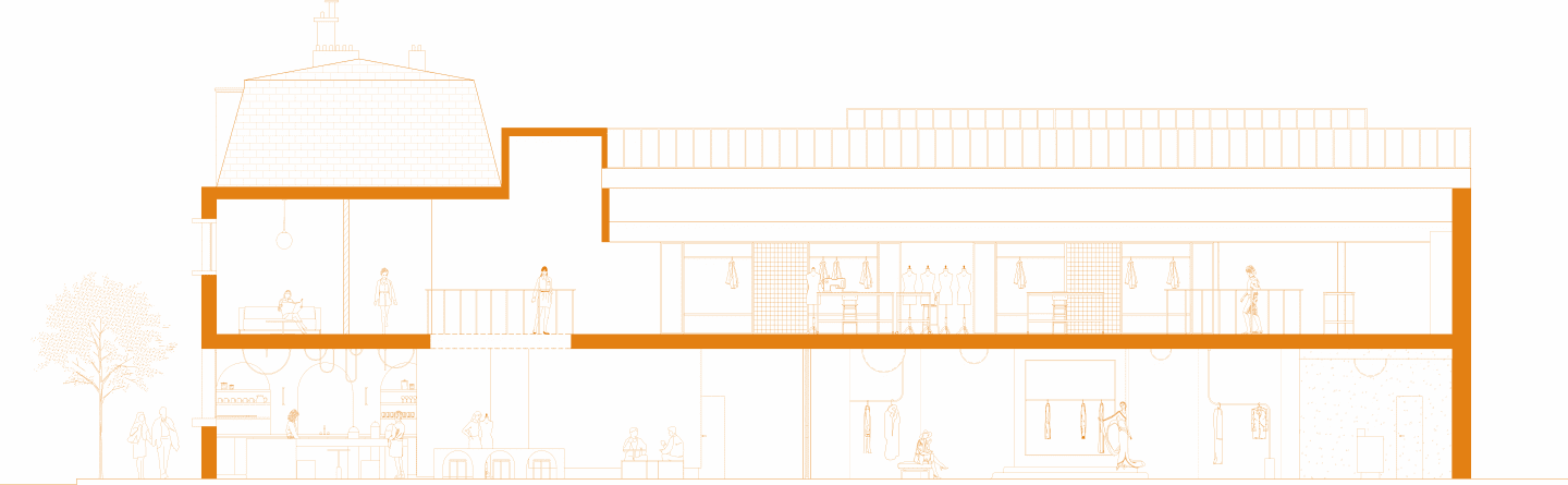 The project for Maison Germanier is located in the 11th arrondissement of Paris. The Ménagerie de Verre now hosts the studios of this young haute couture brand, offering creative, shared workshops to the public. As with Kevin Germanier, who seeks to bring women’s bodies into dialogue with clothes through forms, shapes and fabrics, the idea is to create a conversation between the spaces, their layouts and the custom-designed furniture. This is an entire interior architecture project, born out of the essence of Maison Germanier. Cosy, intimate spaces punctuated by interplays of shadow and light, which change throughout the day, lend a unique ambiance to this place of encounters and creation.