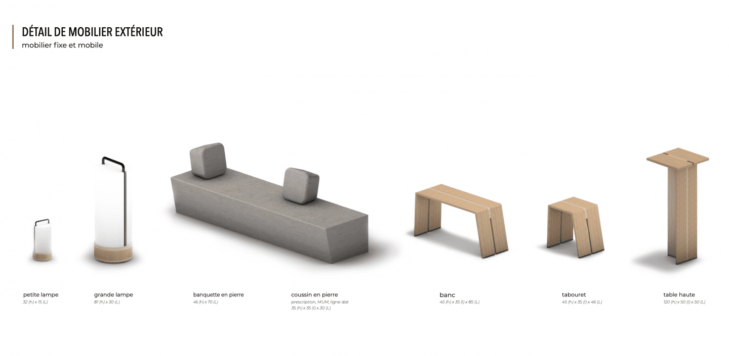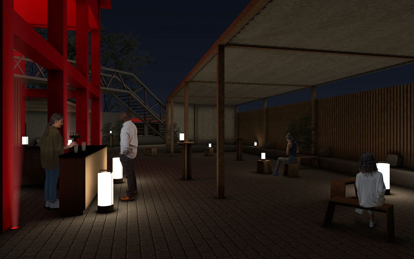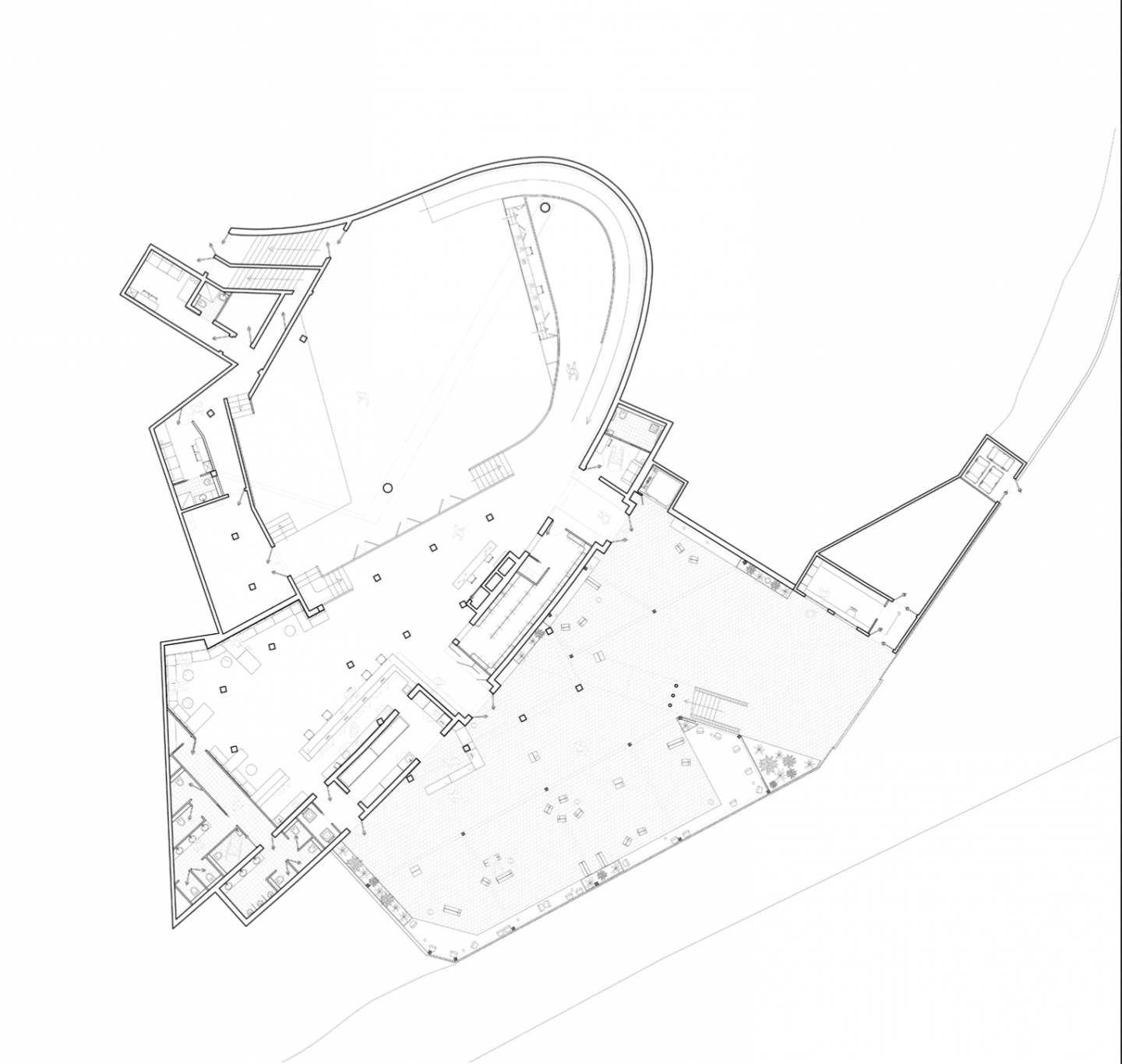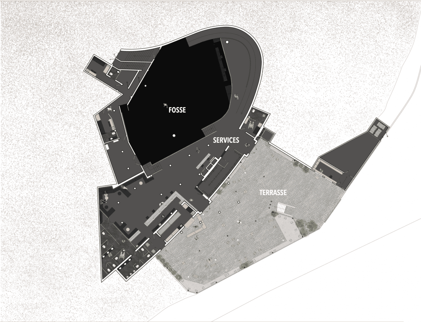 Après analyse du lieu existant, l’enjeu du projet a été de réaménager le Trabendo pour proposer aux visiteurs une balade séquencée créant une porosité entre l’intérieur et l’extérieur. La salle a été divisée en trois espaces distincts qui s’articulent chacun autour d’un point central : la fosse rattachée à la scène, les services concentrés autour du bar et enfin la terrasse construite autour d’un espace de détente. Les transitions entre ces espaces s’effectuent grâce à différents niveaux ; de la matérialité et des dispositifs de double-peau guident le visiteur au cœur de la fête. Celui-ci vagabonde d’une ambiance très naturelle et minérale jusqu’à une boîte noire, lieu de fête et de concerts. L’espace de service se présente quant à lui comme l’association de la fosse et de la terrasse.