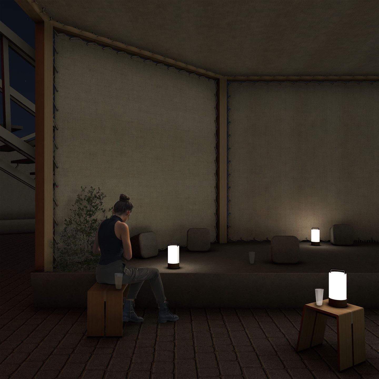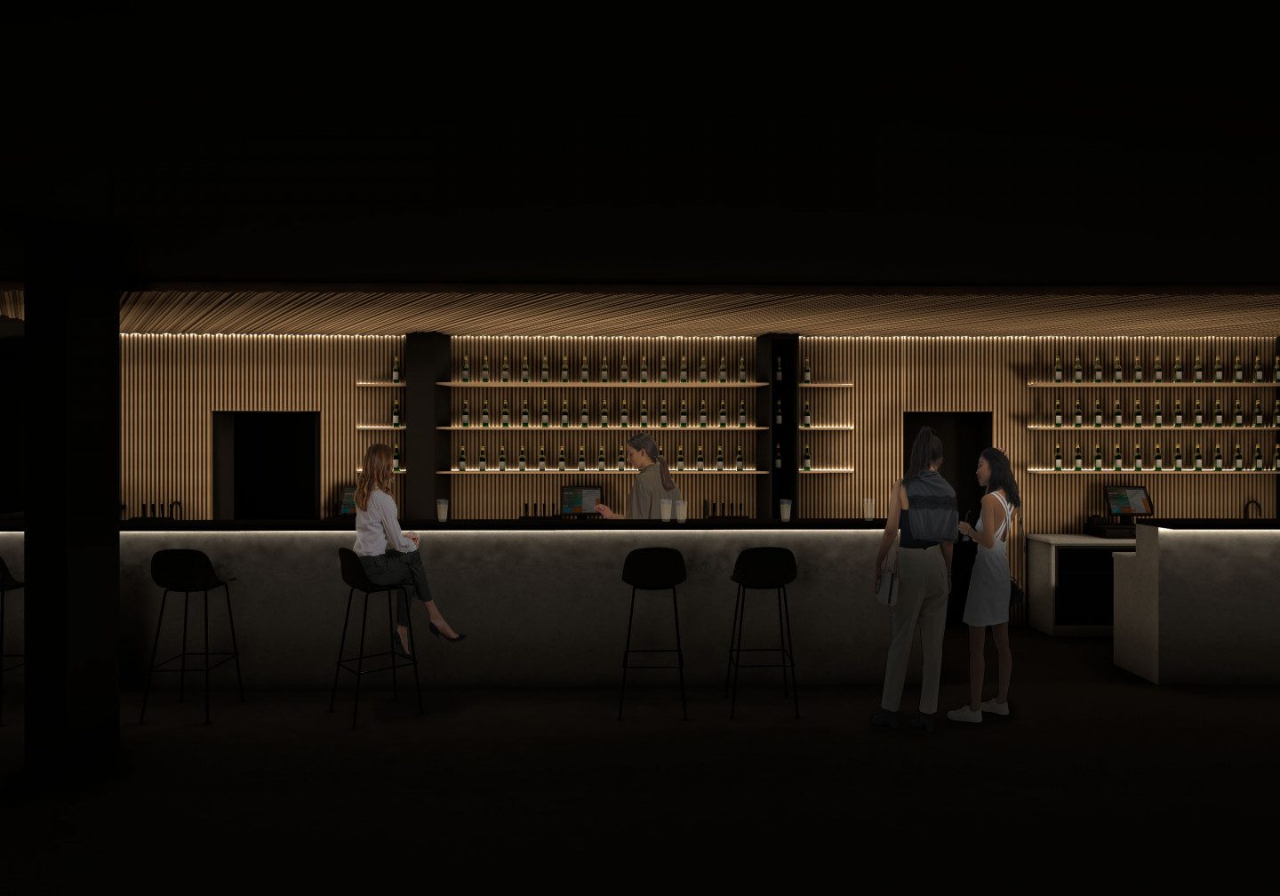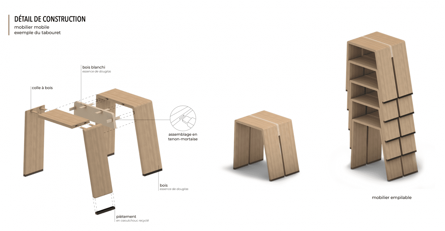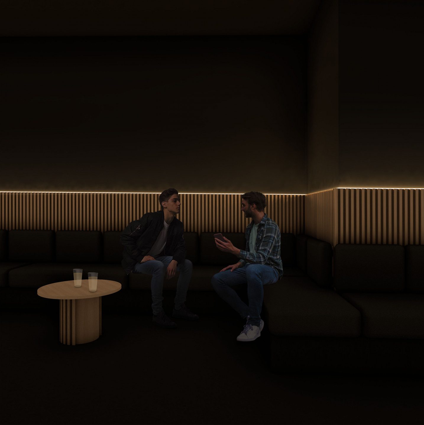 Après analyse du lieu existant, l’enjeu du projet a été de réaménager le Trabendo pour proposer aux visiteurs une balade séquencée créant une porosité entre l’intérieur et l’extérieur. La salle a été divisée en trois espaces distincts qui s’articulent chacun autour d’un point central : la fosse rattachée à la scène, les services concentrés autour du bar et enfin la terrasse construite autour d’un espace de détente. Les transitions entre ces espaces s’effectuent grâce à différents niveaux ; de la matérialité et des dispositifs de double-peau guident le visiteur au cœur de la fête. Celui-ci vagabonde d’une ambiance très naturelle et minérale jusqu’à une boîte noire, lieu de fête et de concerts. L’espace de service se présente quant à lui comme l’association de la fosse et de la terrasse.