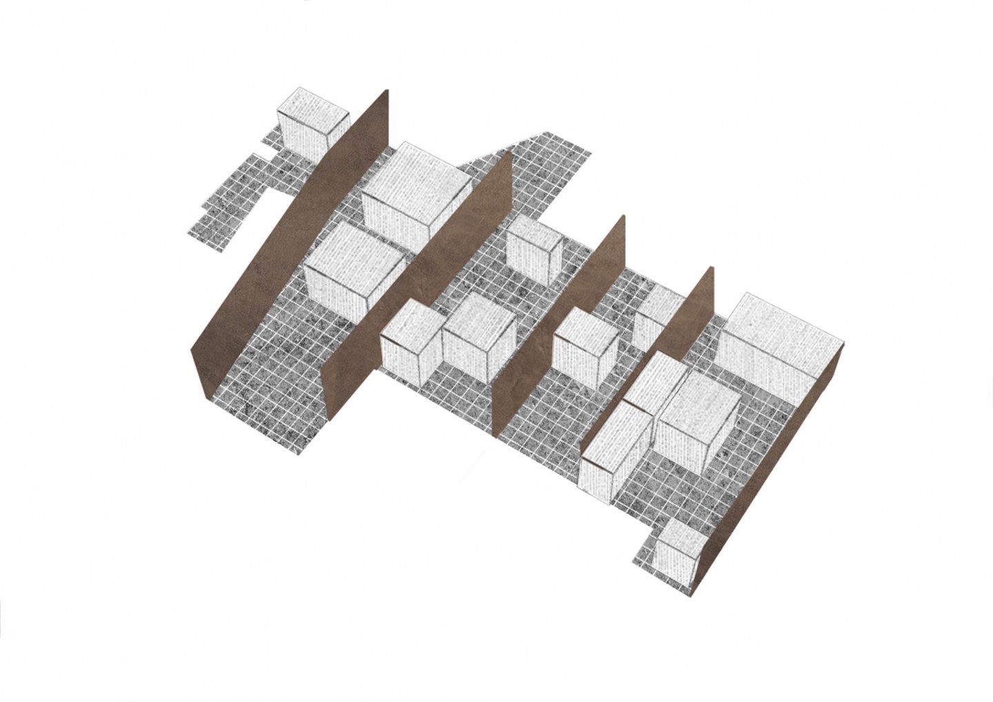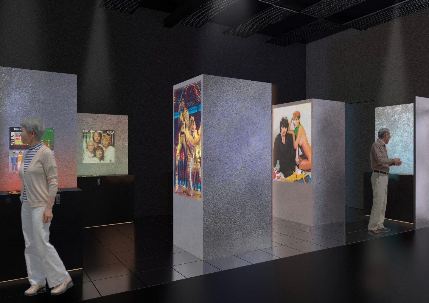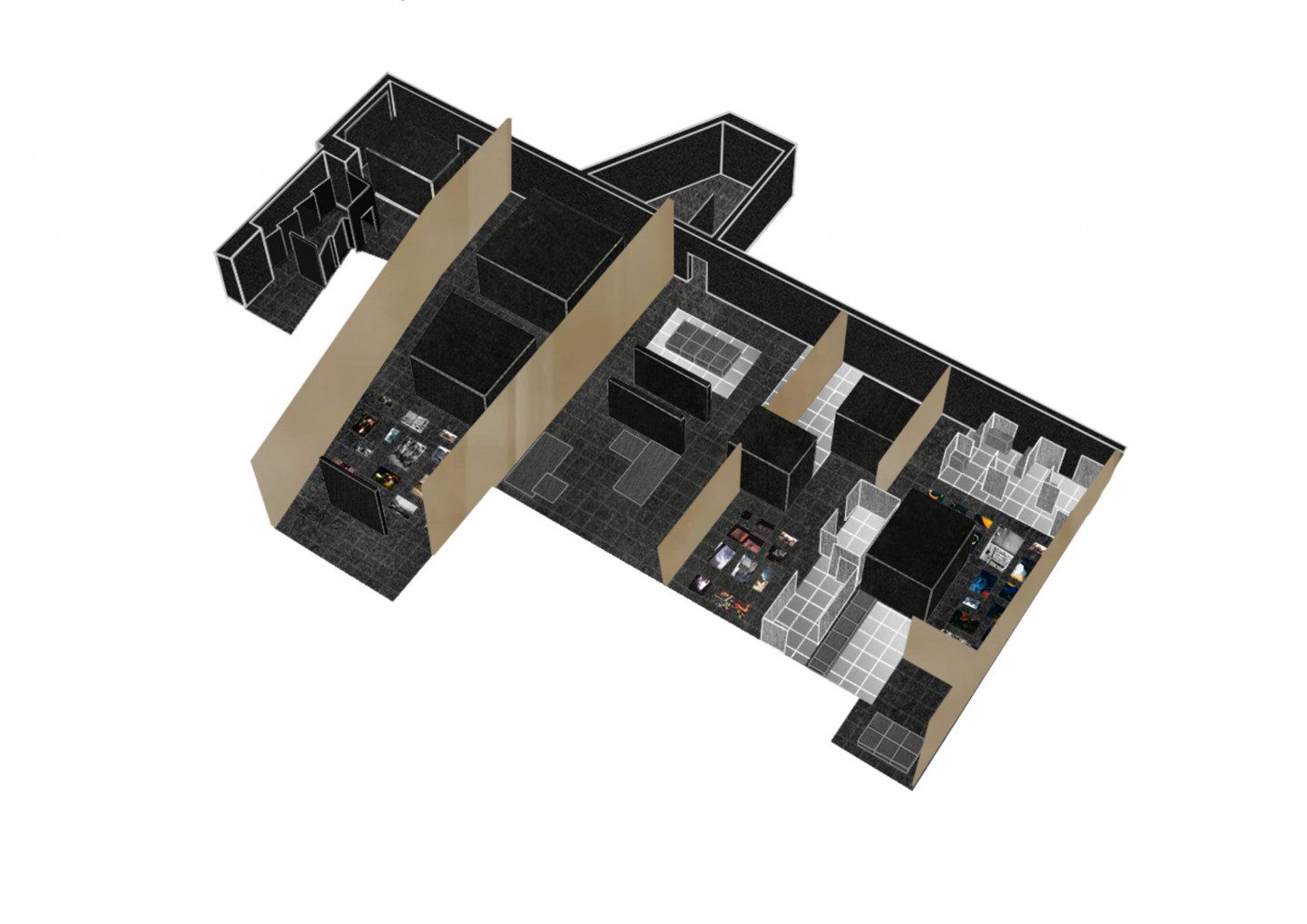 Ensuite, des petits volumes s’extrudent du sol servant de podiums et de présentoirs pour les oeuvres, notamment celles en volume. Enfin, les volumes les plus grands créent des salles fermées ou semi-fermées. Ce sont des salles de projection ou des espaces immersifs, plongeant le visiteurs dans la peau d’un clubber des a70.