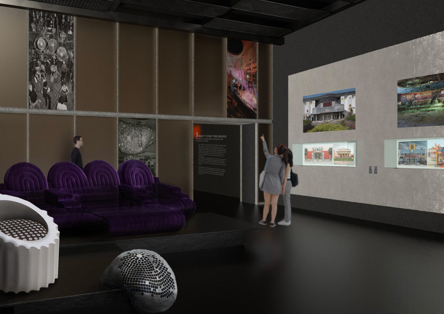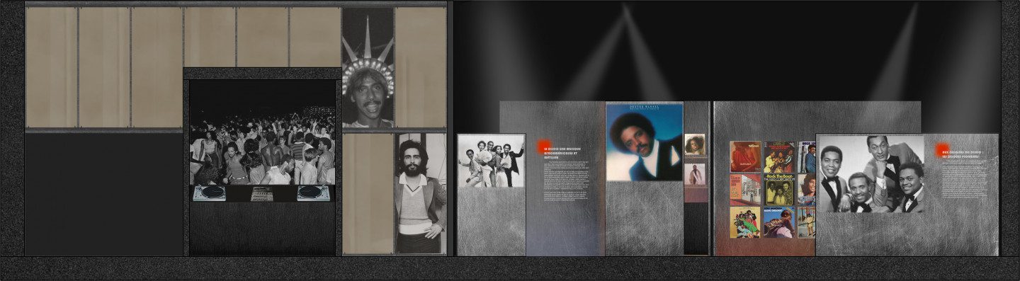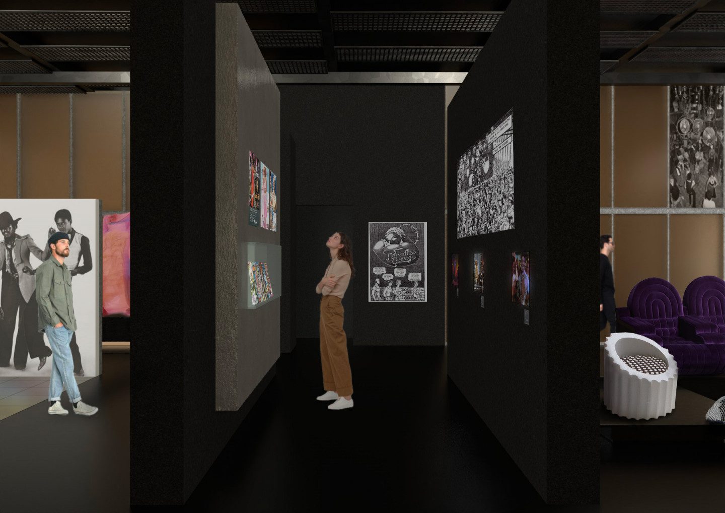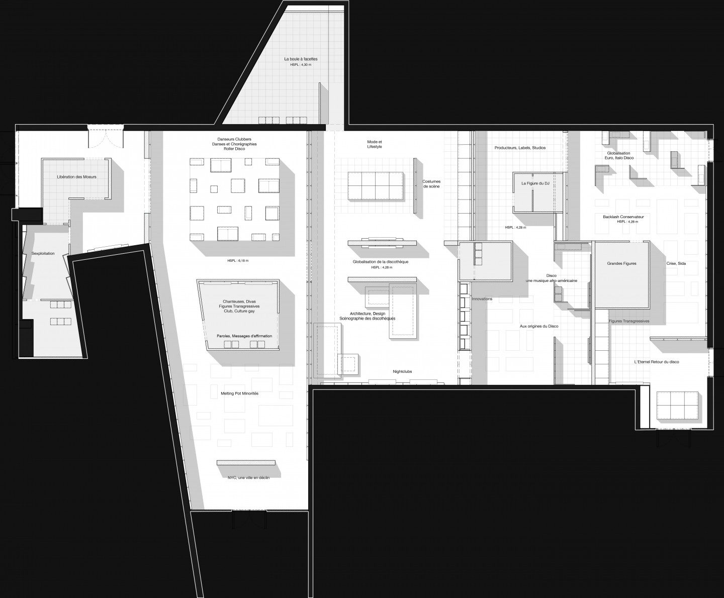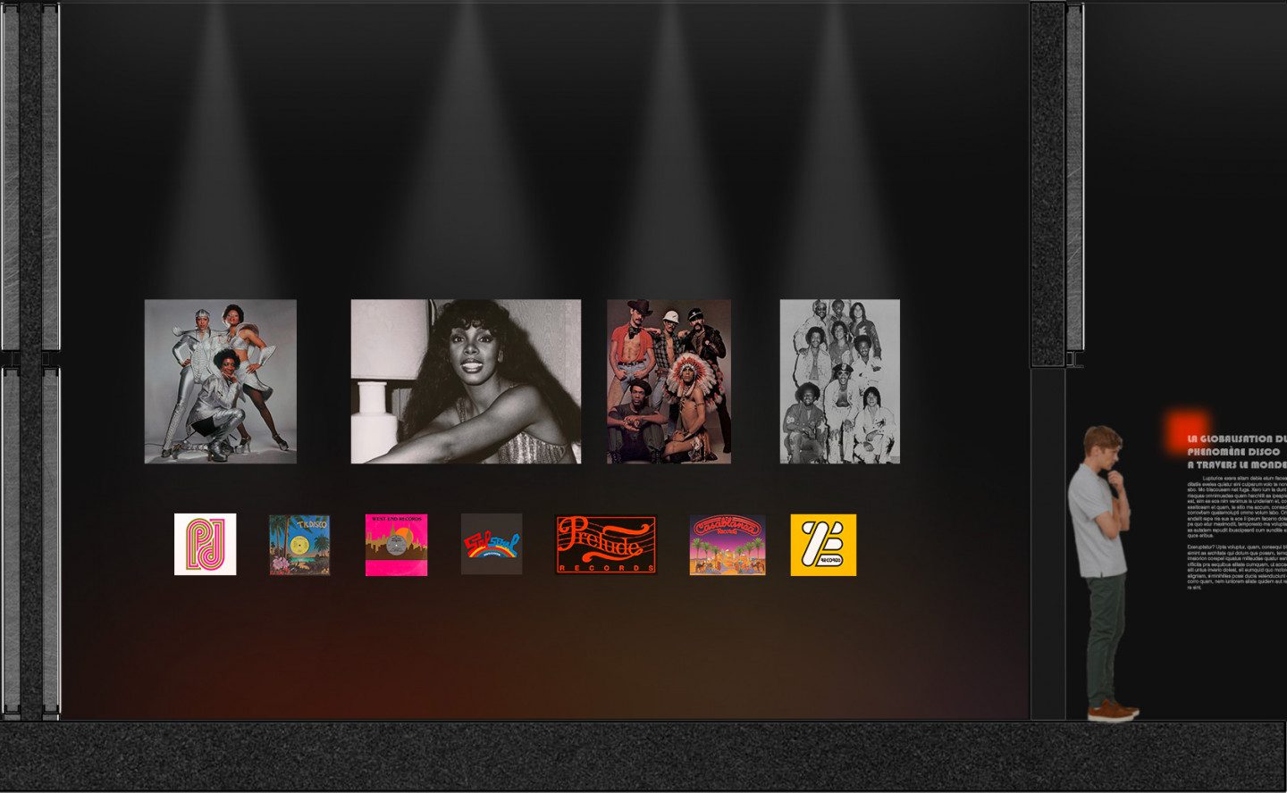 La salle est traitée comme une boite noire accueillant l’exposition. Les visiteurs sont plongés dans une atmosphère évoquant le New-York des a70, s’inspirant de l’esthétique et de la hauteur des parois de gratte-ciels. Pour ce fait, les parois séparatrices sont recouvertes d’un revêtement vitré et teinté.