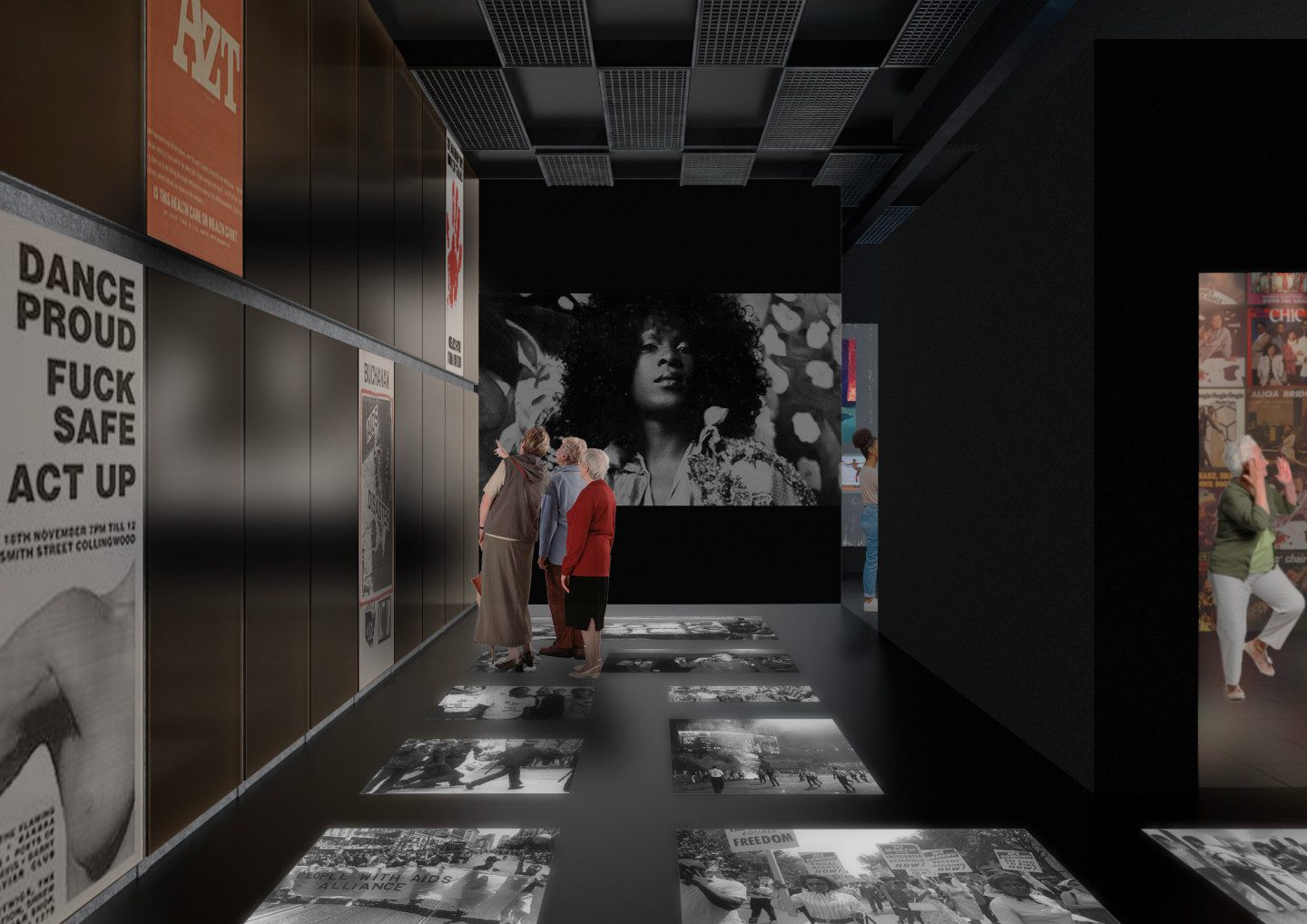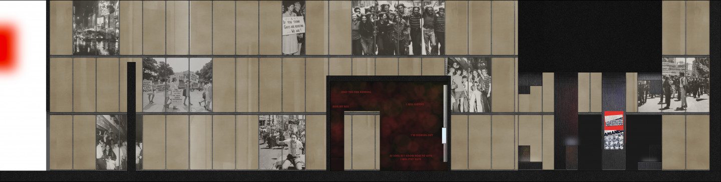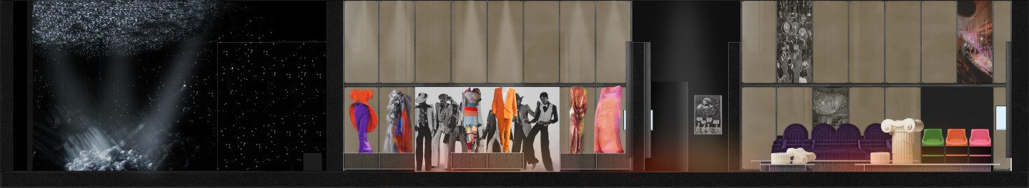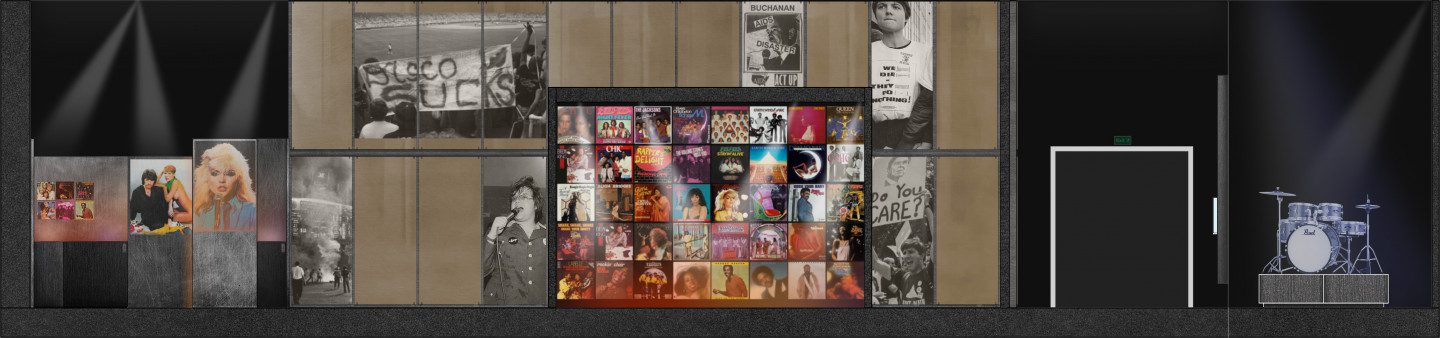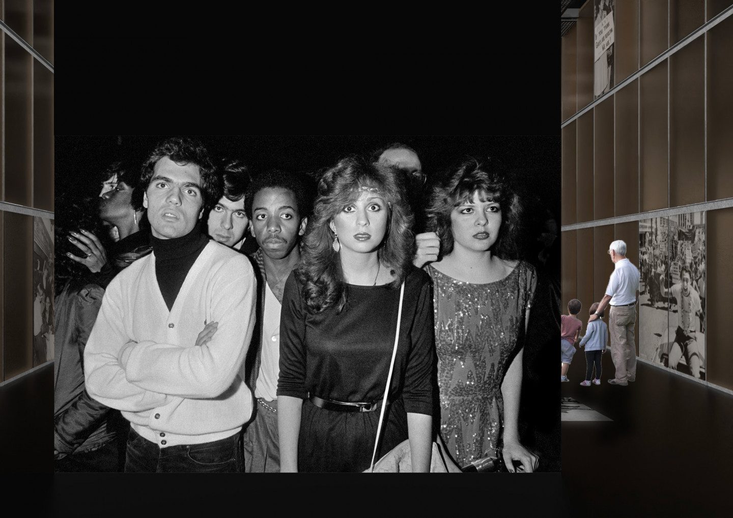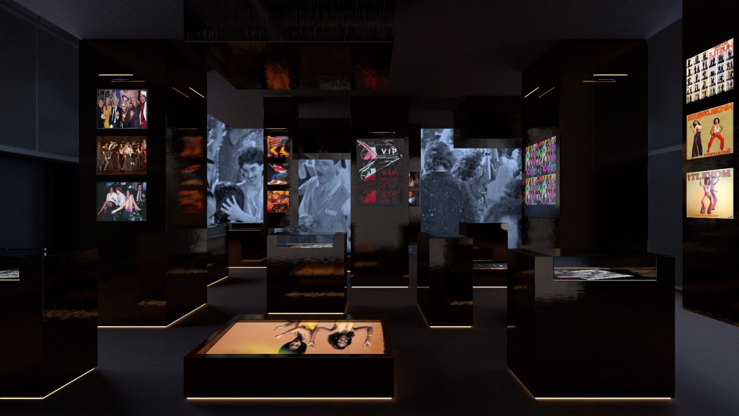 La salle est traitée comme une boite noire accueillant l’exposition. Les visiteurs sont plongés dans une atmosphère évoquant le New-York des a70, s’inspirant de l’esthétique et de la hauteur des parois de gratte-ciels. Pour ce fait, les parois séparatrices sont recouvertes d’un revêtement vitré et teinté.