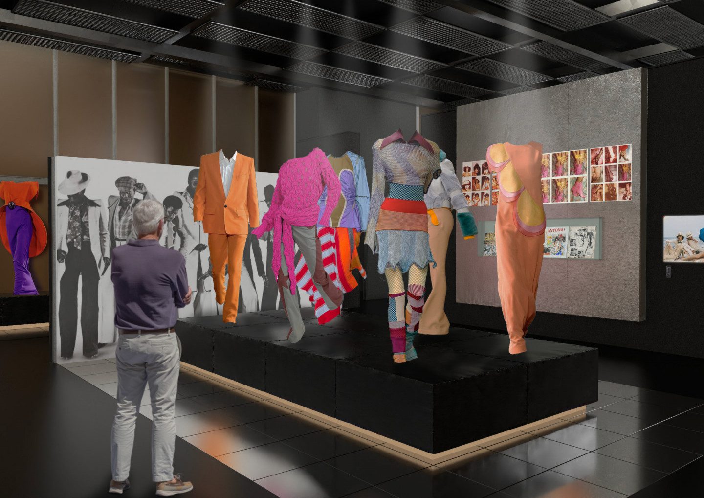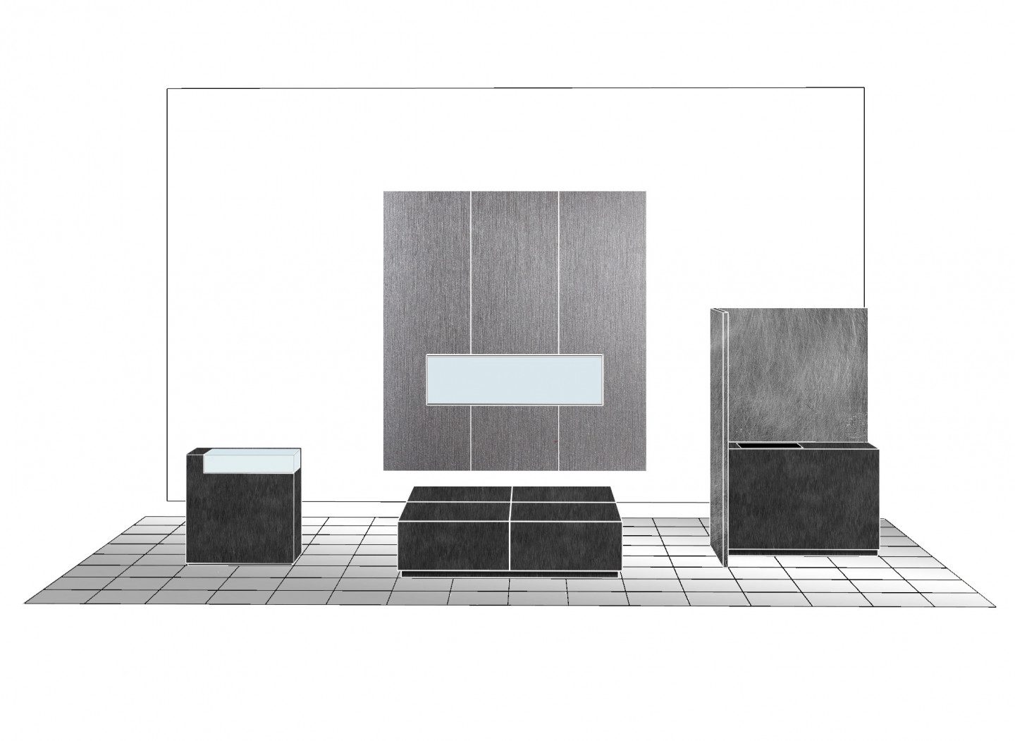 Un volume qui intègre une vitrine d’exposition. Une estrade présentant les oeuvres en volume comme des vêtements, des meubles et des objets divers. Le troisième présentoir possède un écran encastré. Autour de celui-ci s’installe une paroi à l’effet acier brossé.