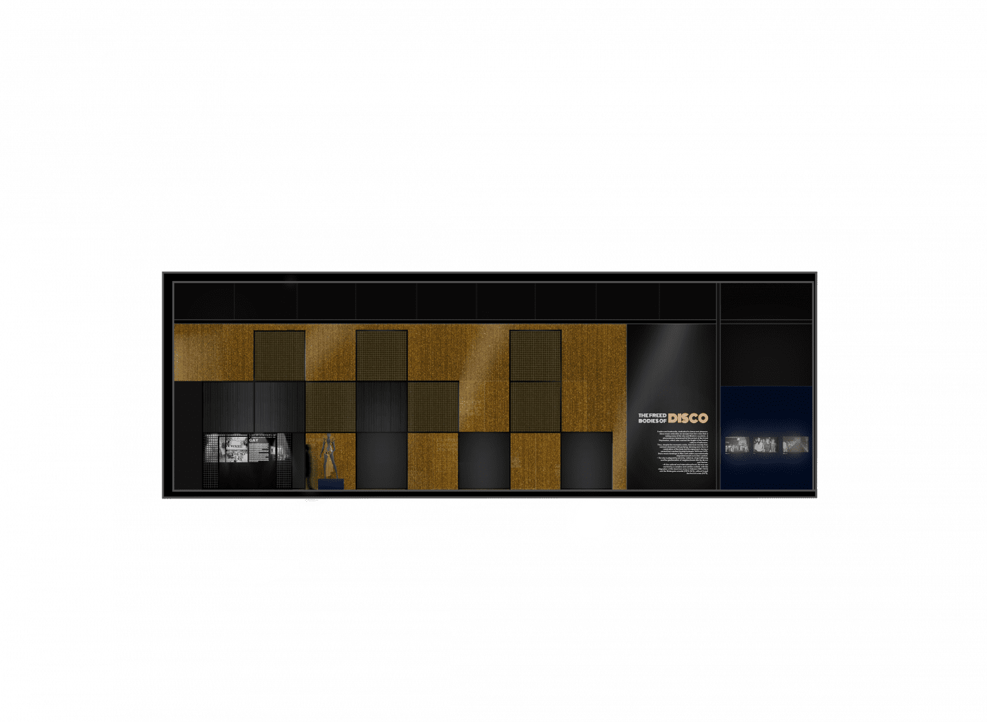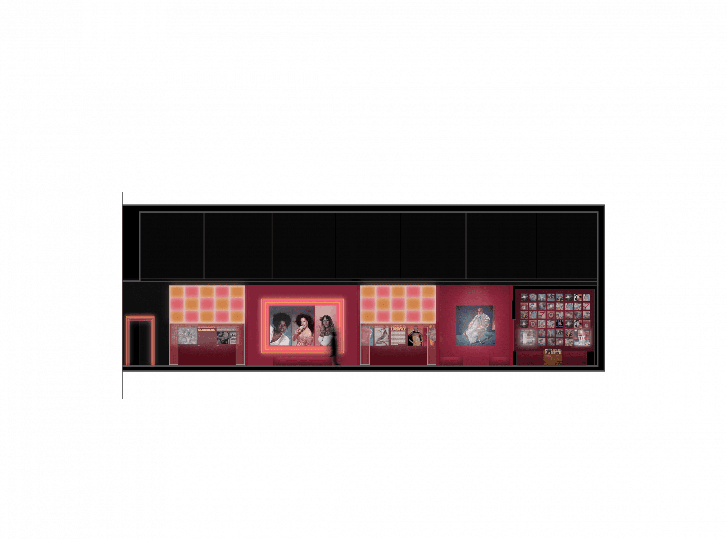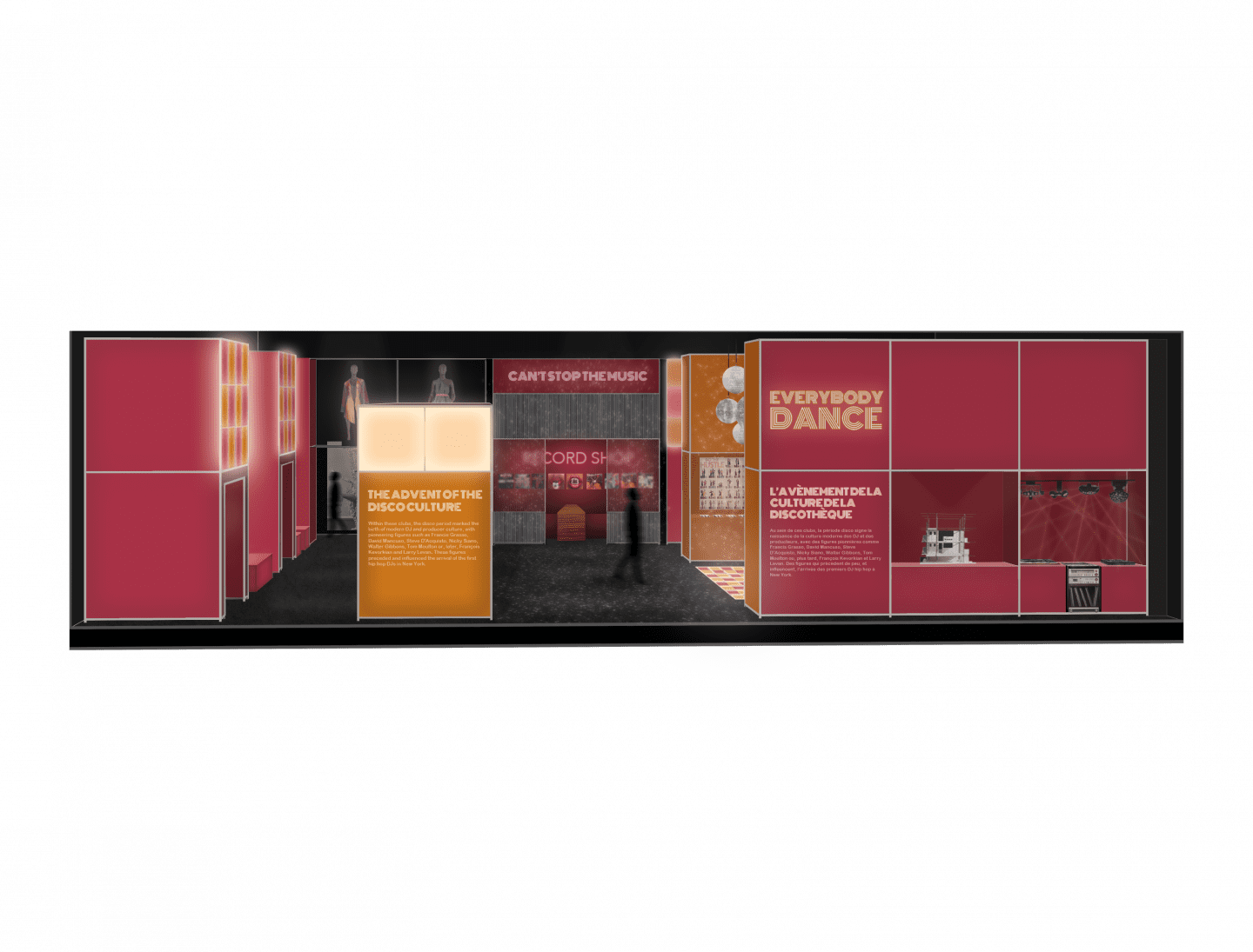 Le mouvement Disco est le moyen pour les populations de s’échapper de ce climat tendu, le temps d’une soirée. La seconde partie de l’exposition s’imprègne des codes de la discothèque avec des couleurs vives et une bande son de titres de l’époque. Les grandes figures du mouvement Disco trônent dans l’espace.