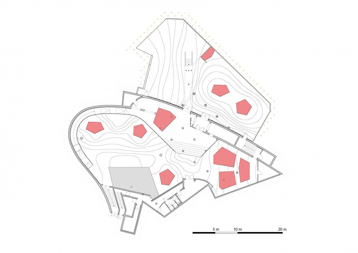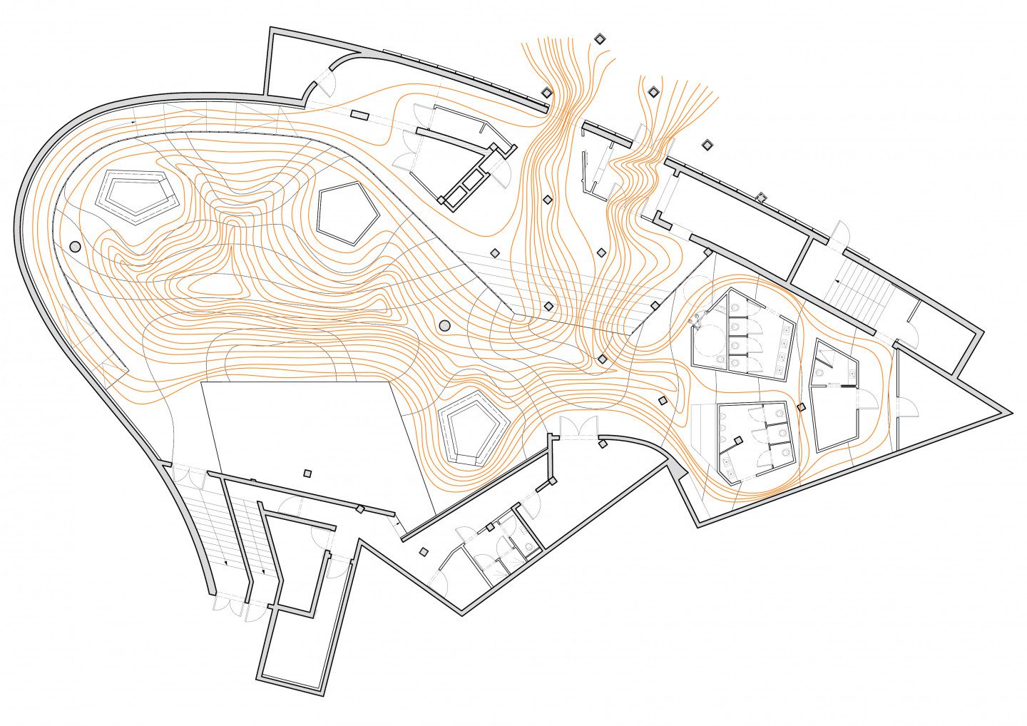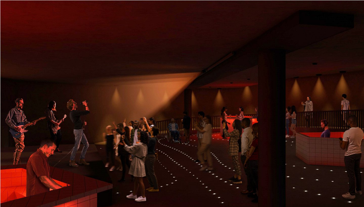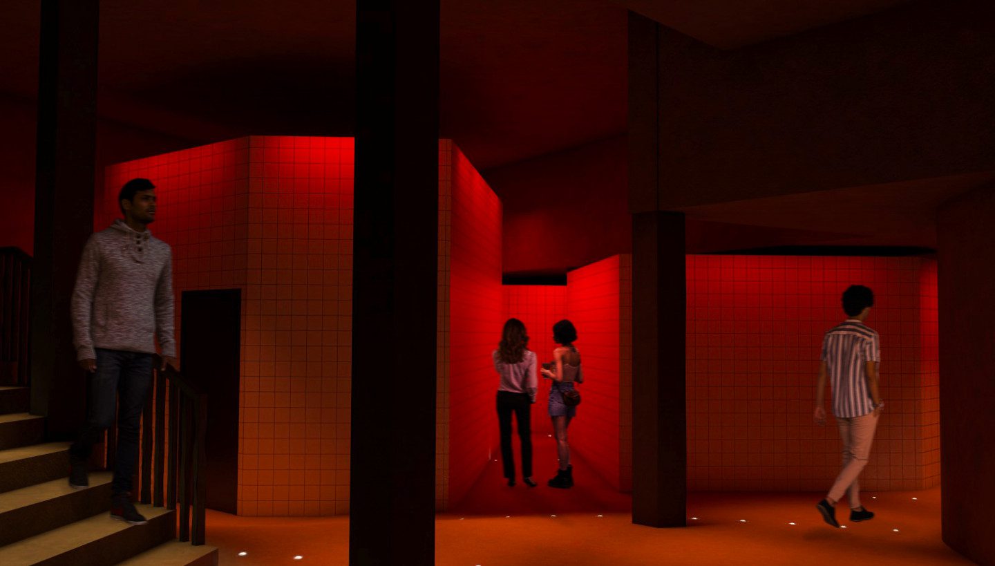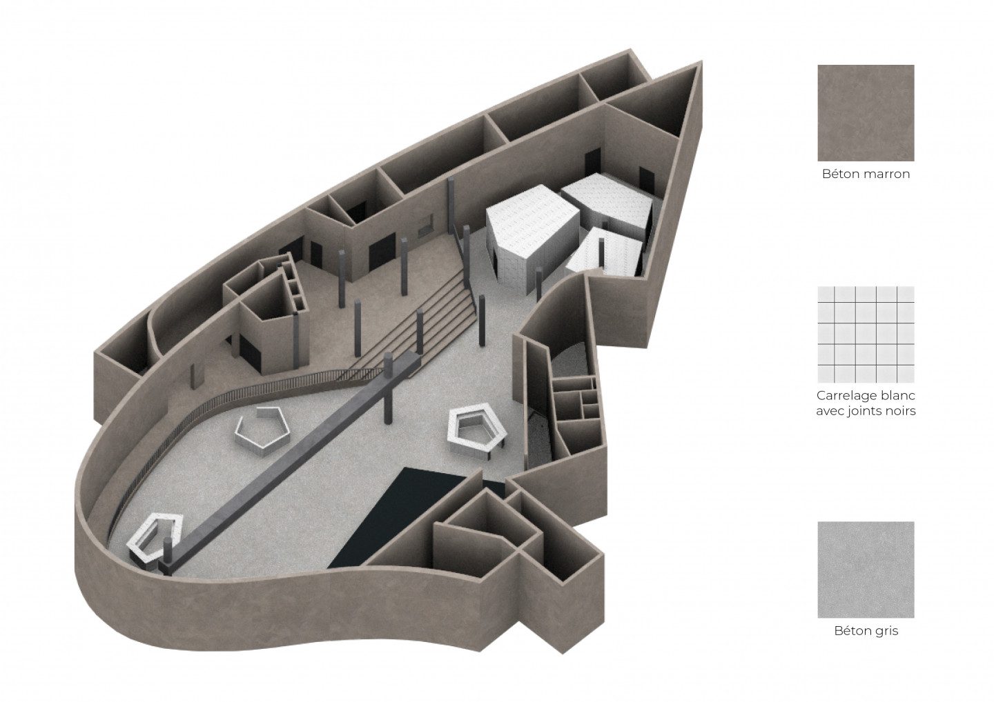 Ce projet du réaménagement du Trabendo propose la transposition du principe de la déconstruction programmatique du parc à l’échelle de l’intérieur de la salle. Cette approche intègre les principes de conception du parc tout en explorant les manipulations topologiques créées par Peter Eisenman. Après analyser des données statistiques de l'espace actuel, ces paramètres sont devenus exploitables au niveau architectural et ont permis la création d’une nouvelle topographie, un « sol fédérateur » pour l'ensemble du programme. L'aménagement intérieur prend en compte l'architecture extérieure et offre une continuité ; les colonnes de la folie semblent traverser le plancher pour se poser dans l'espace intérieur et par fragmentation, devenir des blocs des différents services proposés par la salle.