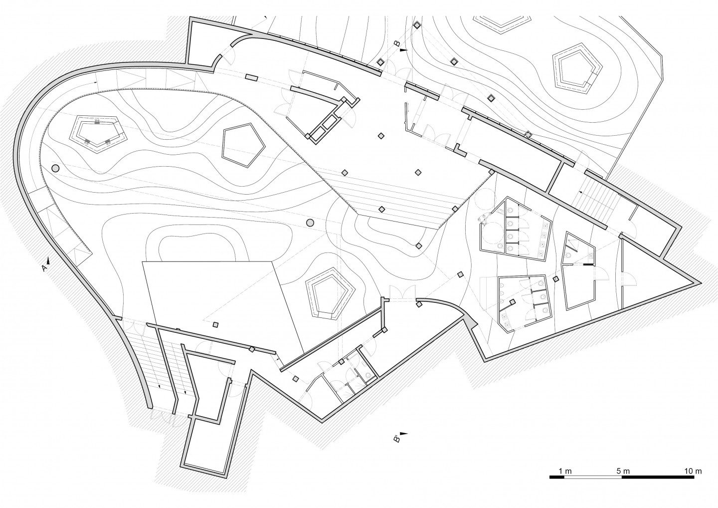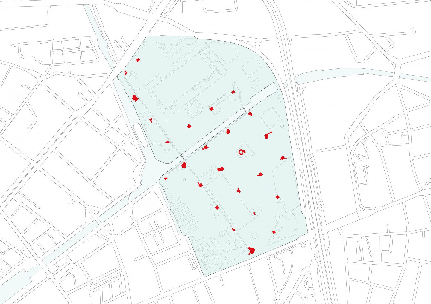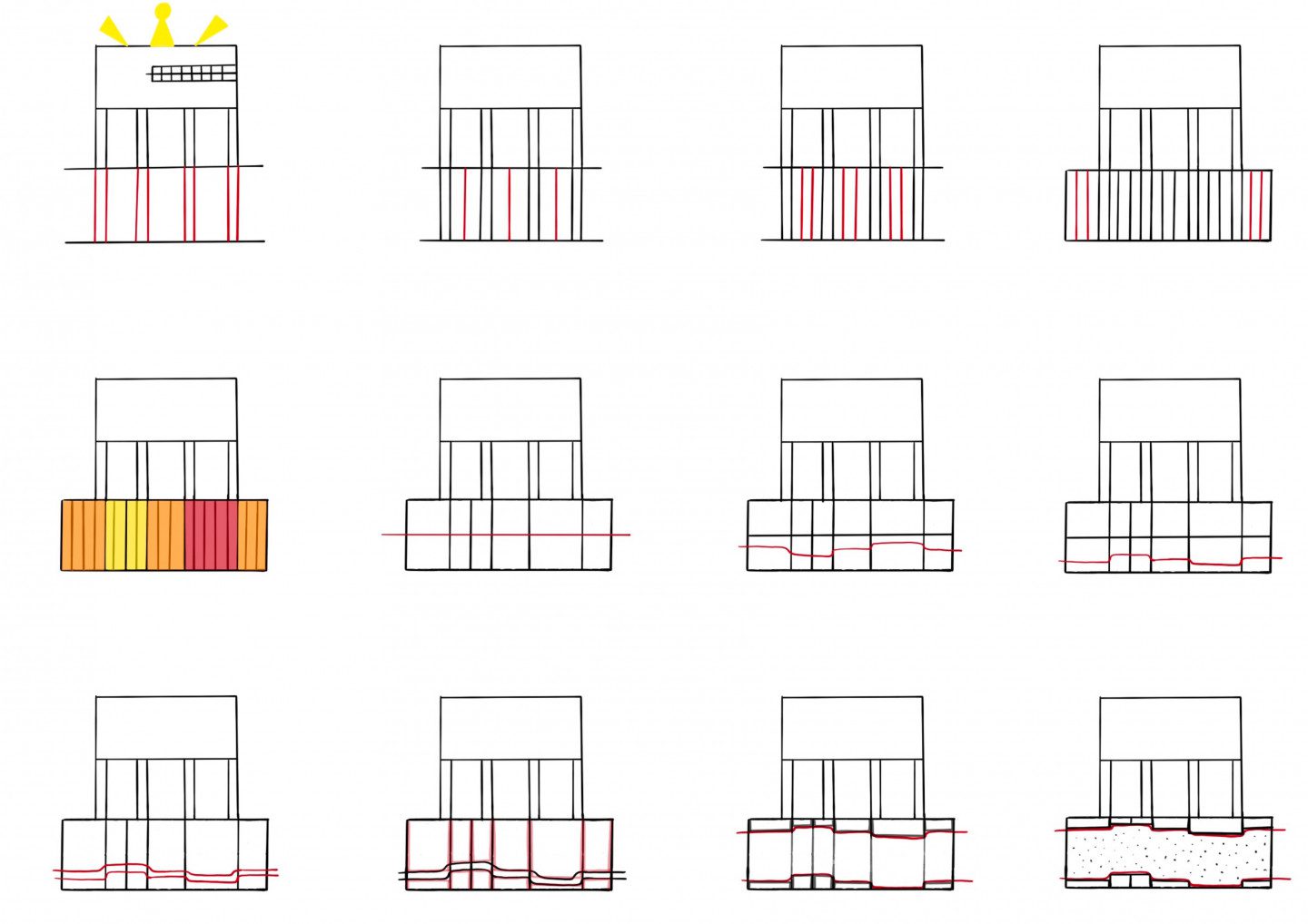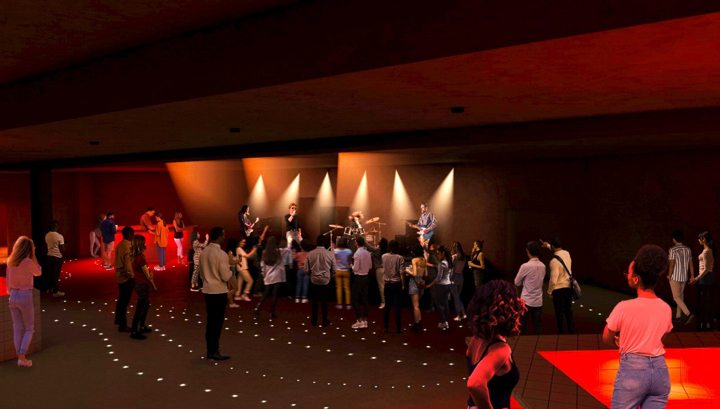 Ce projet du réaménagement du Trabendo propose la transposition du principe de la déconstruction programmatique du parc à l’échelle de l’intérieur de la salle. Cette approche intègre les principes de conception du parc tout en explorant les manipulations topologiques créées par Peter Eisenman. Après analyser des données statistiques de l'espace actuel, ces paramètres sont devenus exploitables au niveau architectural et ont permis la création d’une nouvelle topographie, un « sol fédérateur » pour l'ensemble du programme. L'aménagement intérieur prend en compte l'architecture extérieure et offre une continuité ; les colonnes de la folie semblent traverser le plancher pour se poser dans l'espace intérieur et par fragmentation, devenir des blocs des différents services proposés par la salle.