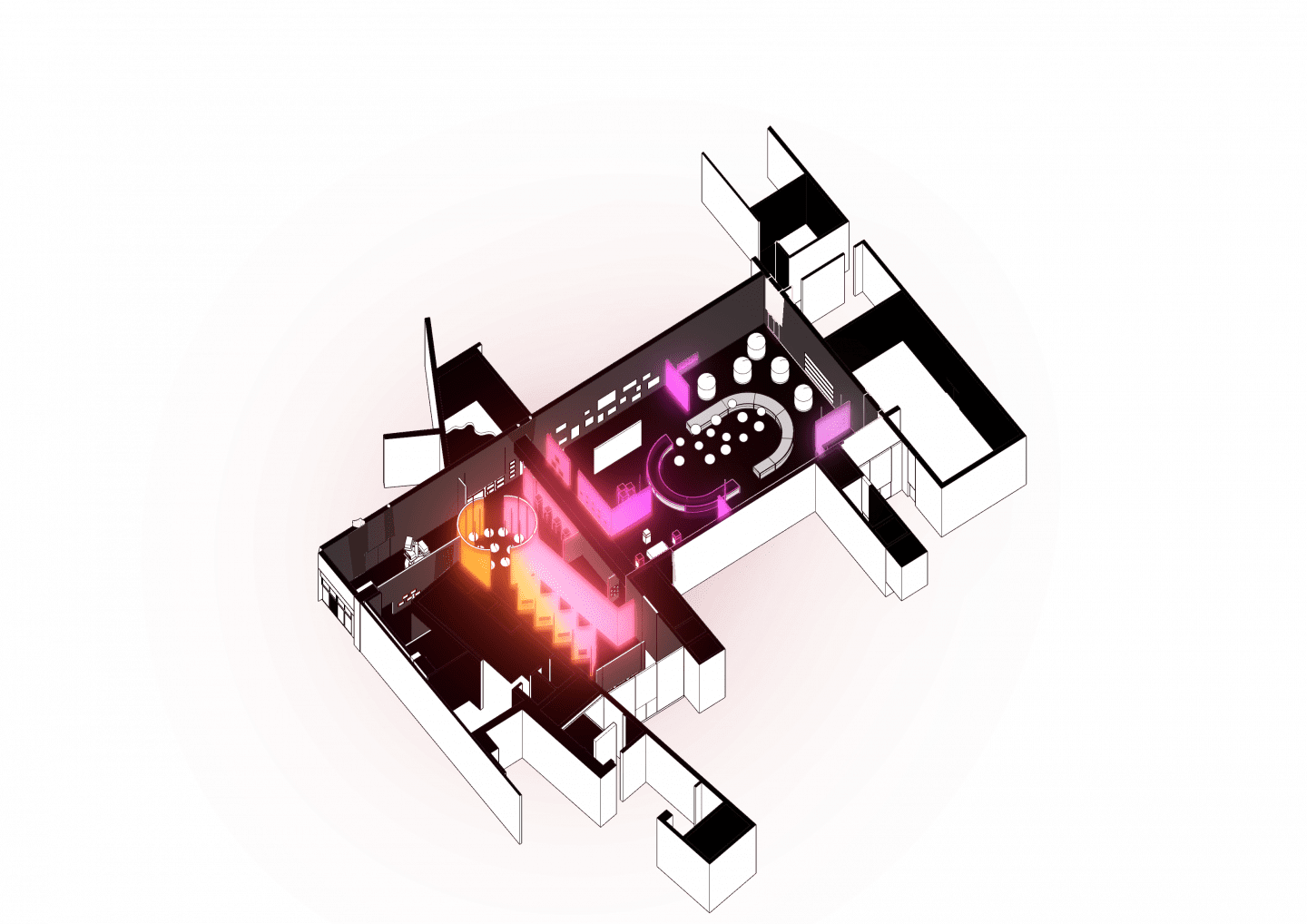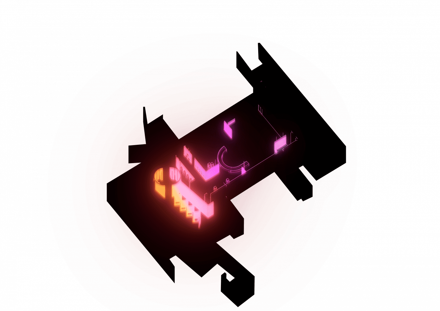 Nous tirons parti de la transparence du polycarbonate pour le traiter par des jeux de lumières en éclairant la tranche supérieur grâce à des bandeaux LED, créant un dégradé de tons oranges vers le rose pâle. Ce traitement par la lumière accentue l’effet progressif et permettant de diffuser la lumière à la manière des discothèques.