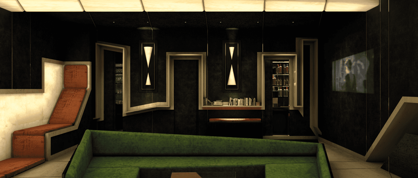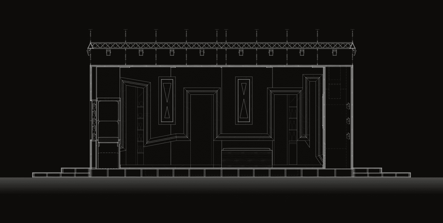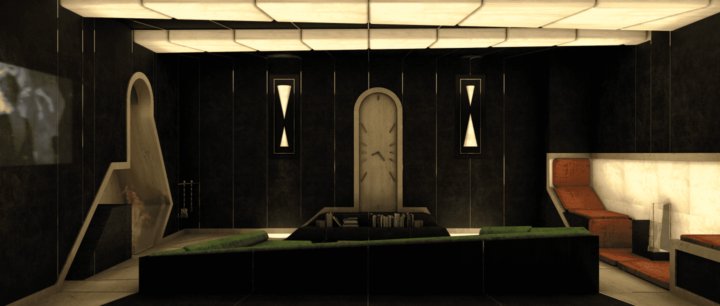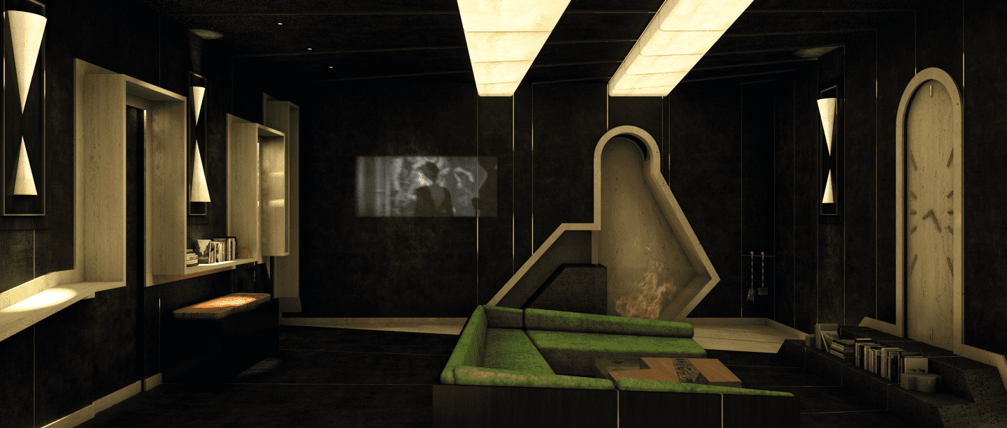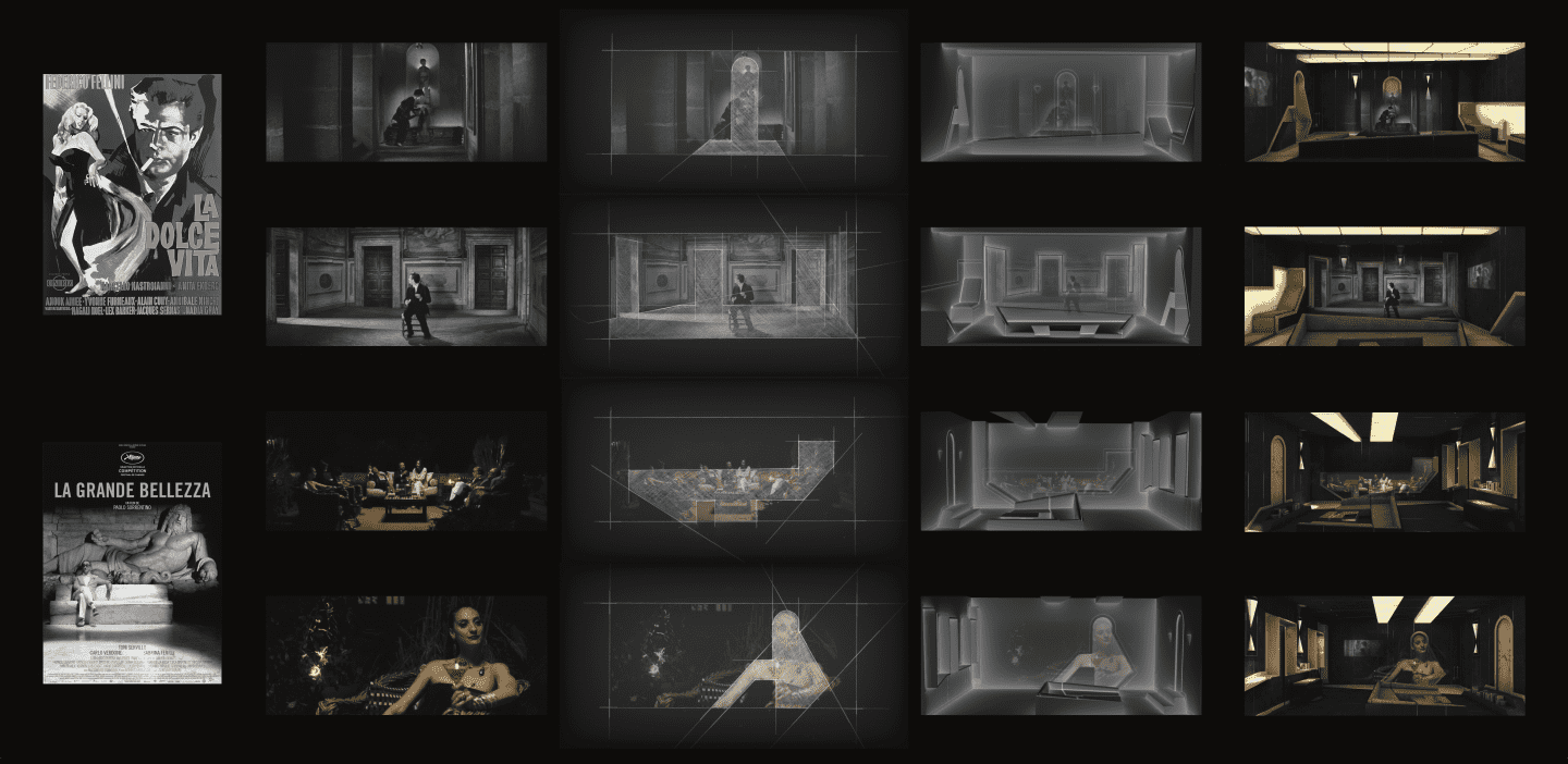 Tout concorde avec les dires de Federico Fellini. En fusionnant les murs de la pièce créée avec les plans cinématographiques, le salon nous emportera dans l’imaginaire intemporel convoqué par le cinéma, tout en nous maintenant dans la réalité temporelle convoquée par cet espace.