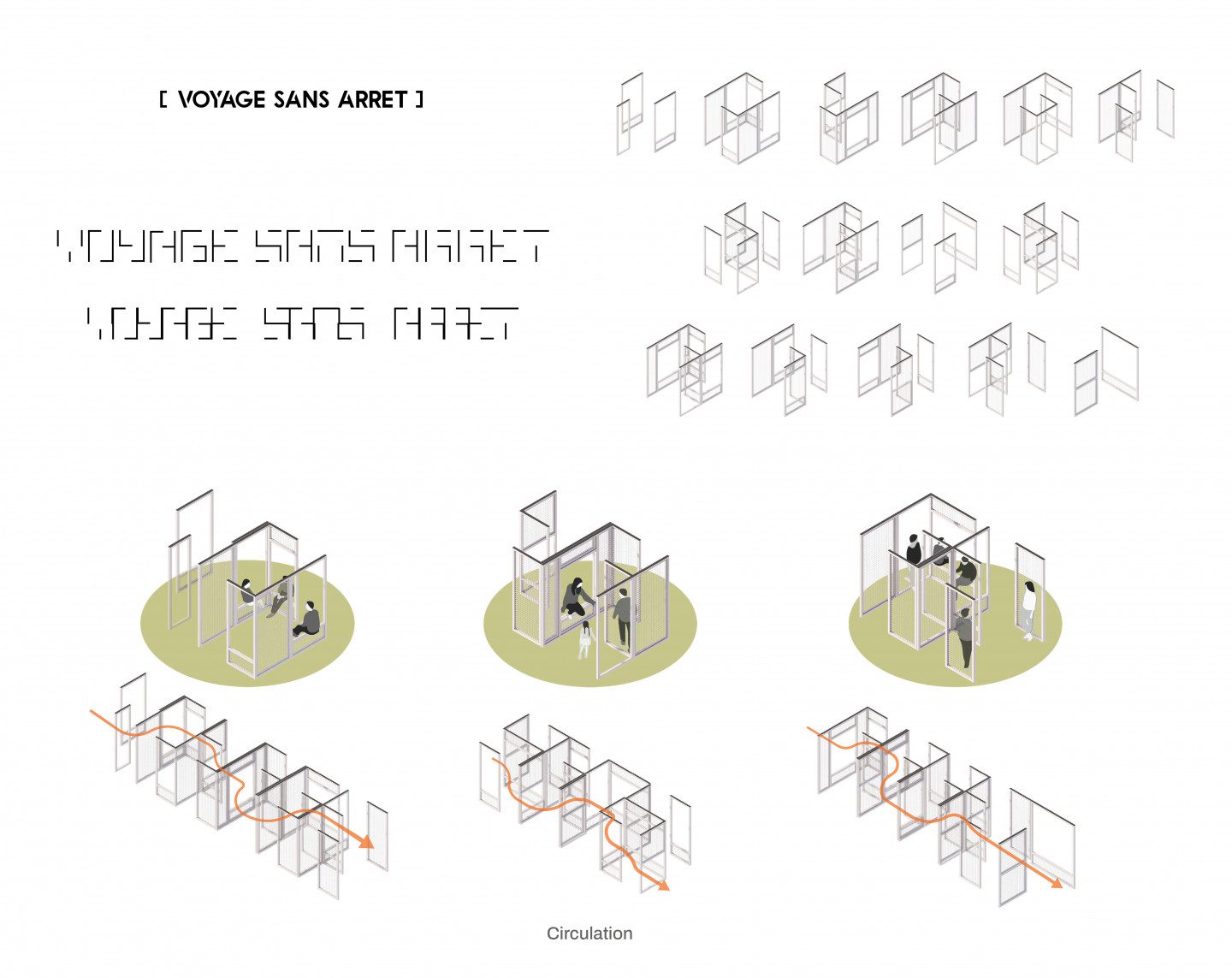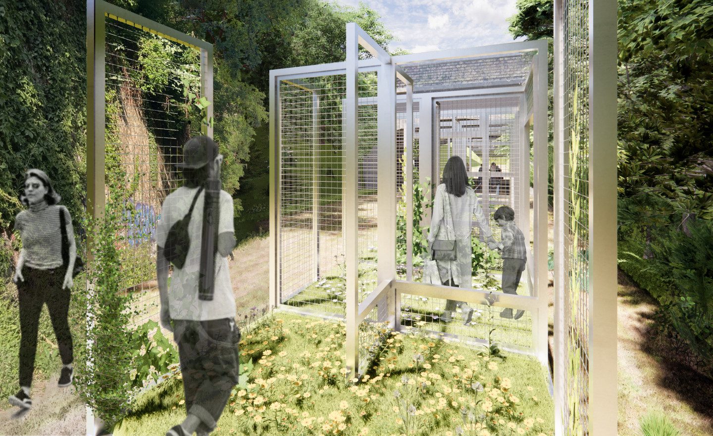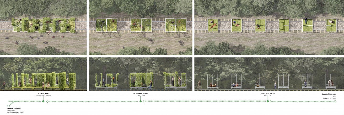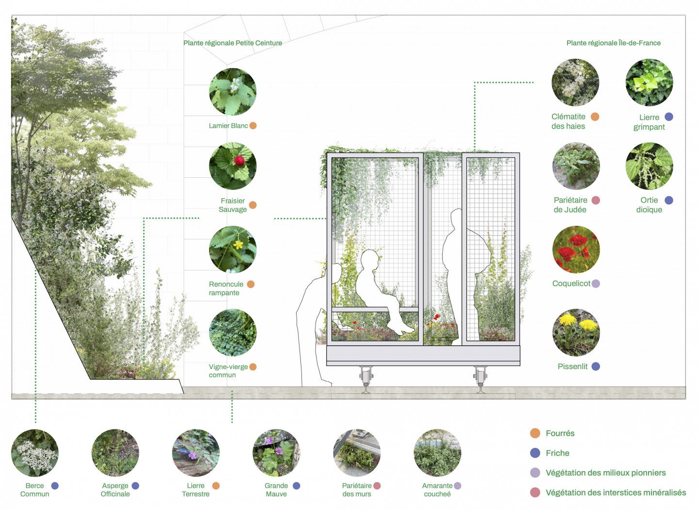 Les plantes locales et les plantes horticoles adaptées à la vie urbaine qui se trouvent dans toute la région parisienne habitent et voyagent dans cet espace, en symbolisant la circulation et la liaison de la nature au sein de la ville.