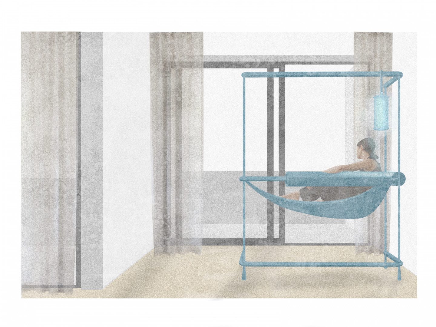 Un hamac qui étend l’espace parfois inutilisable du balcon en un sous espace pour faire la sieste, lire et profiter de l’extérieur même à l’intérieur. Il est souple dans les positions qu’il permet et léger dans son dessin pour laisser passer la lumière.