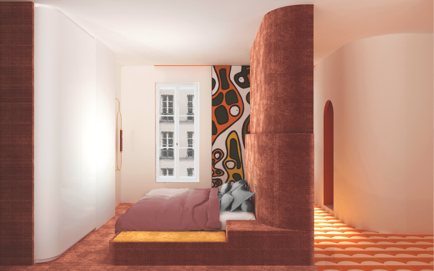 L’usage du velours comme revêtement du sol, du mur et du sommier, intègre le module du lit à la déambulation du somnambule, et permet de conserver l’emprunte de ce dernier, afin de retranscrire ses actions de la nuit passée.