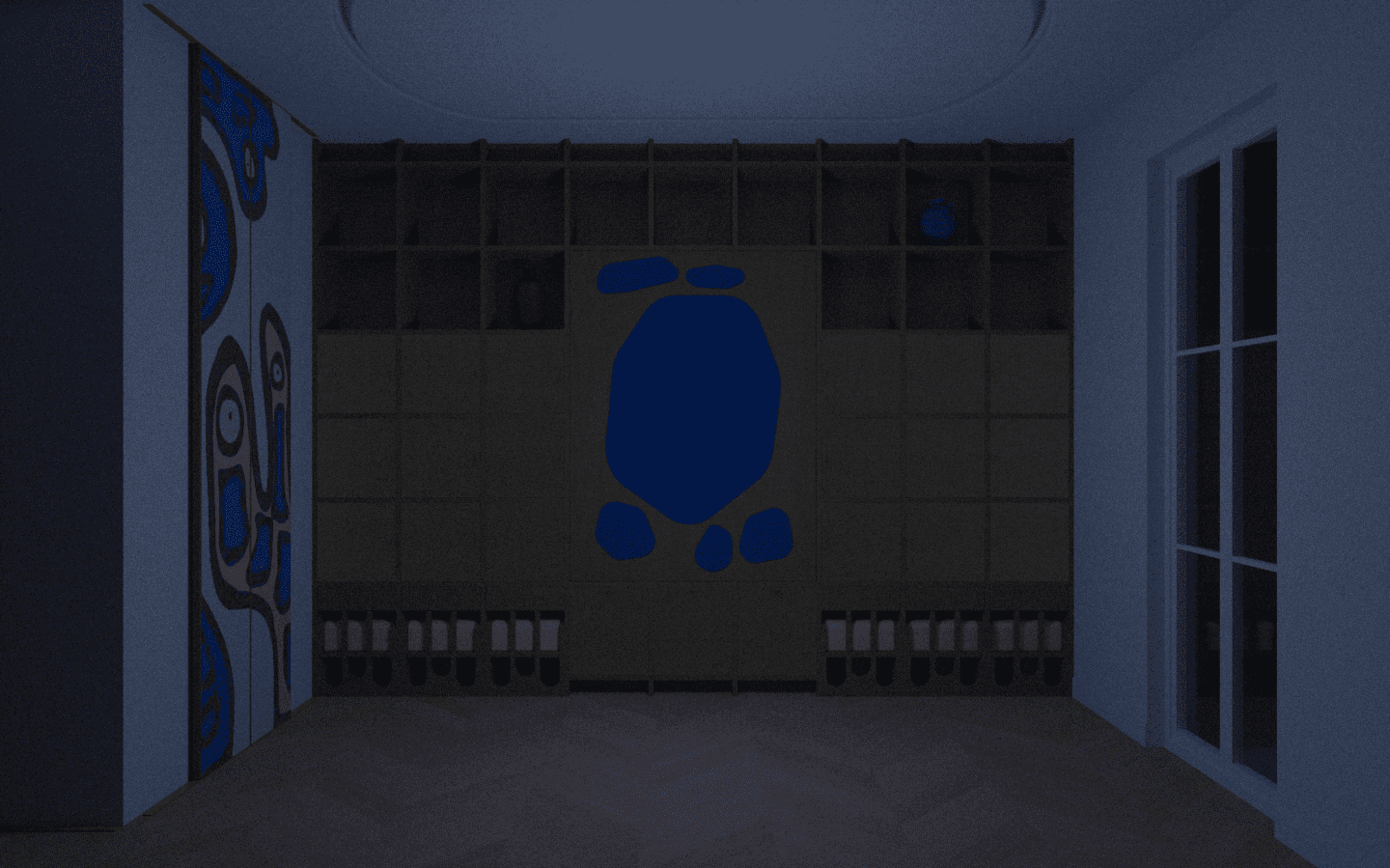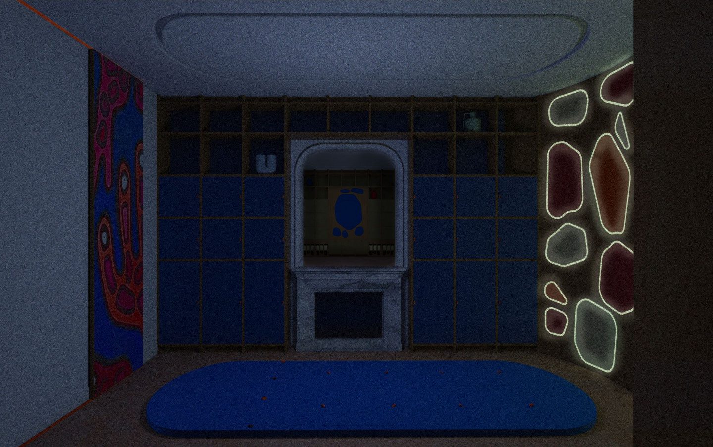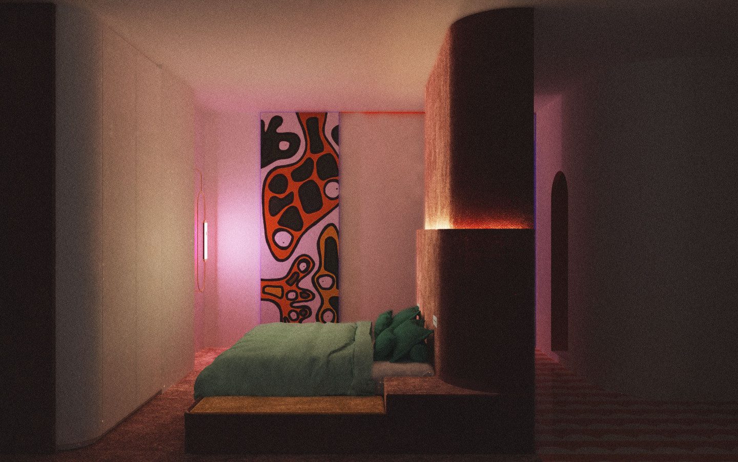 Le volume est souligné par des liserés phosphorescents en périphérie des panneaux acoustiques, minimisant le bruit engendré par le passage du somnambule et lui créant un repère visuel en cas de réveil.