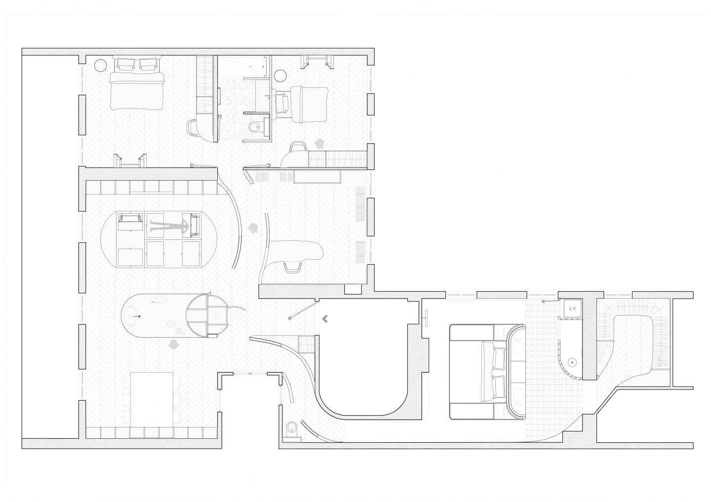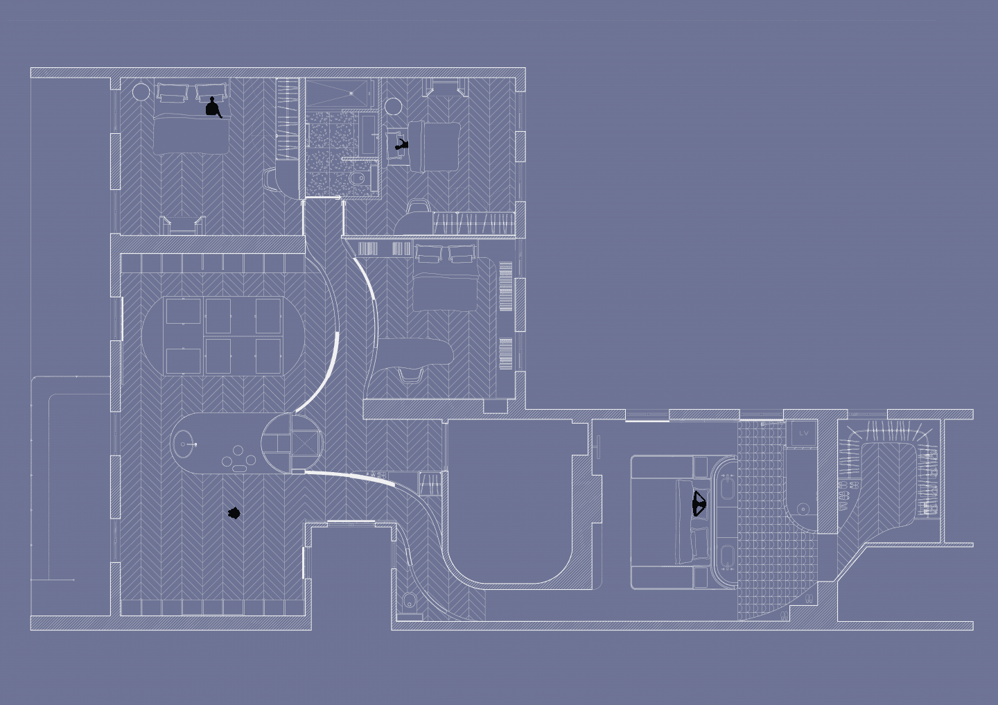 La modularité des espaces au moyen de parois courbes et de portes sur rails favorise un double usage de l’appartement entre le jour et la nuit, en rendant invisible la pathologie du somnambule. La liberté de circuler dans l’appartement en journée pour le somnambule se voit restreinte au simple accès à l’espace de vie la nuit tombée.