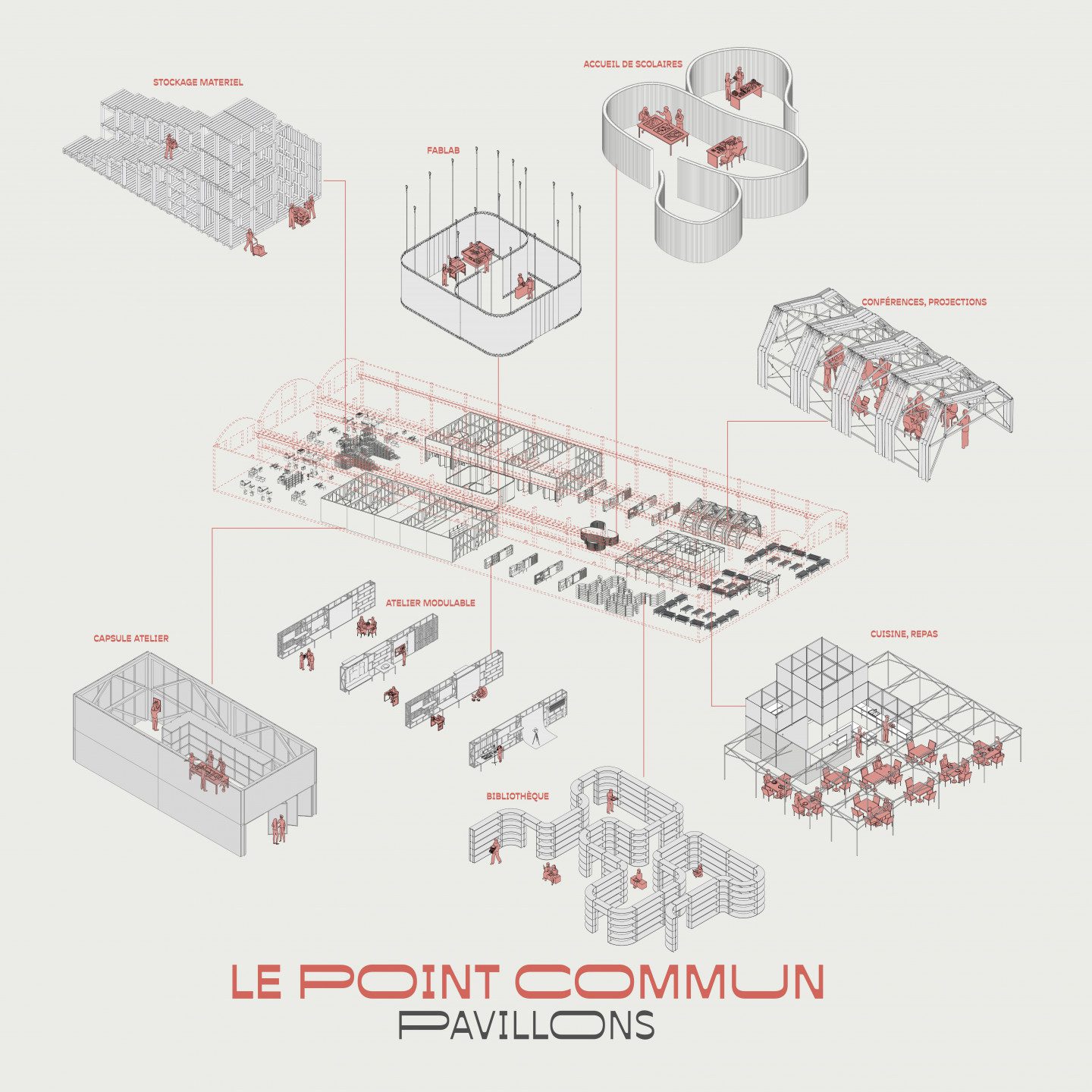 Les pavillons, par la mise en oeuvre inédite de matériaux réemploi, proposent de nouvelles manières de construire et d’habiter l’espace. Ce sont des expérimentations architecturales qui, à l’image du lieu, représentent des espaces de recherche de structures, d’ambiances, d’usages et de conception.