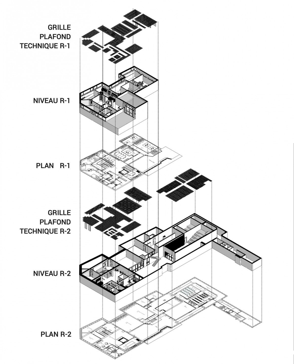 J’ai donc pensé le plafond comme un vrai faux-plafond, suivant une trame, un dessin, un quadrillage de 50x50cm. Cette grille, trame, a un premier rôle technique de passage de gaines, de réseau électrique, de réseau sprinkler. Cette trame et grille se retrouve à chaque niveau, créer une cohérence visuelle à chaque étage.