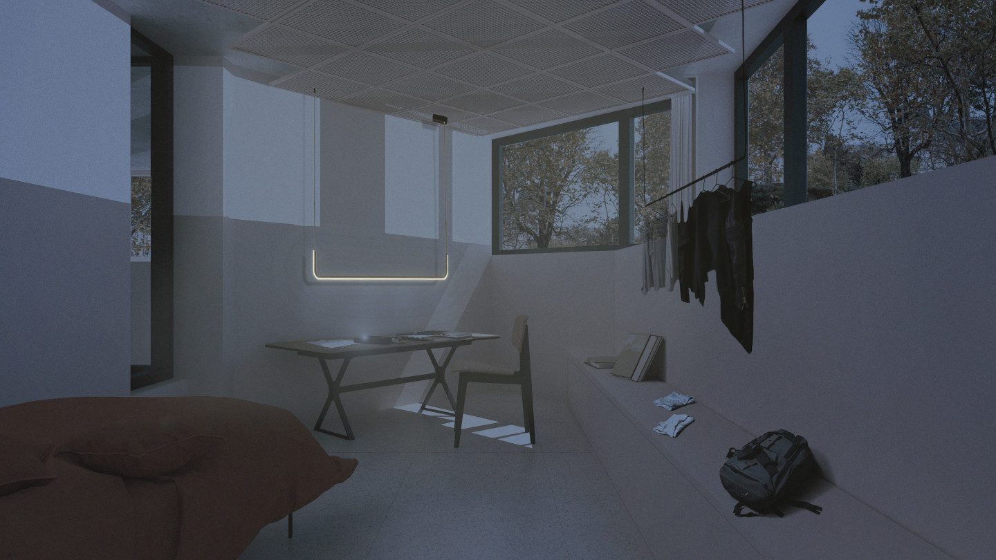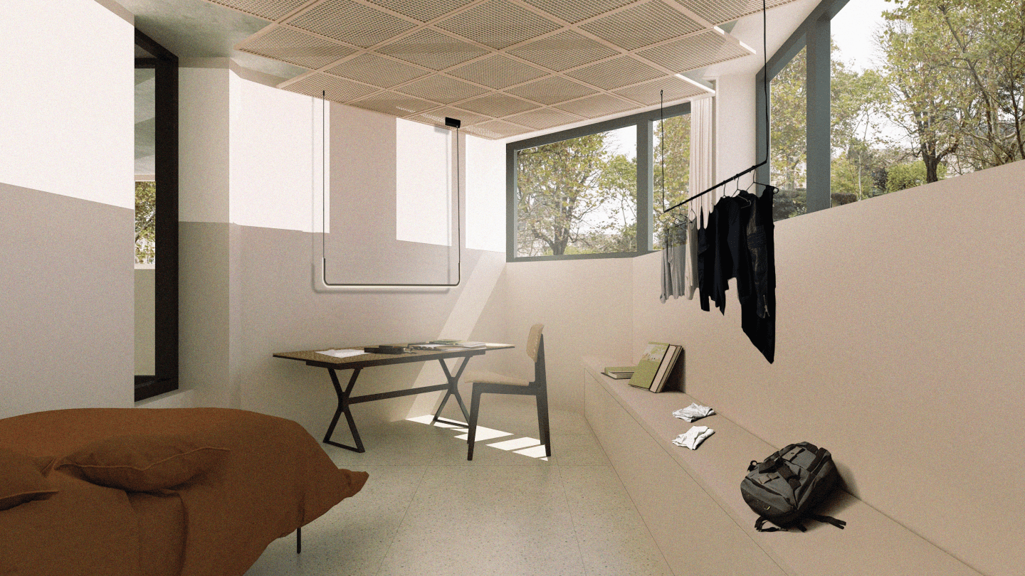 Dans cette perspective d’un lieu qui se veut dynamique, ouvert au public et adapté à l’accueil en résidence d’artistes, l’organisation spatiale a quelque peu était remaniée afin d’y ajouter un programme ajouté. Ce programme ajouté c’est l’accueil sur place de résidents en hébergement, ce qui n’est actuellement pas le cas.