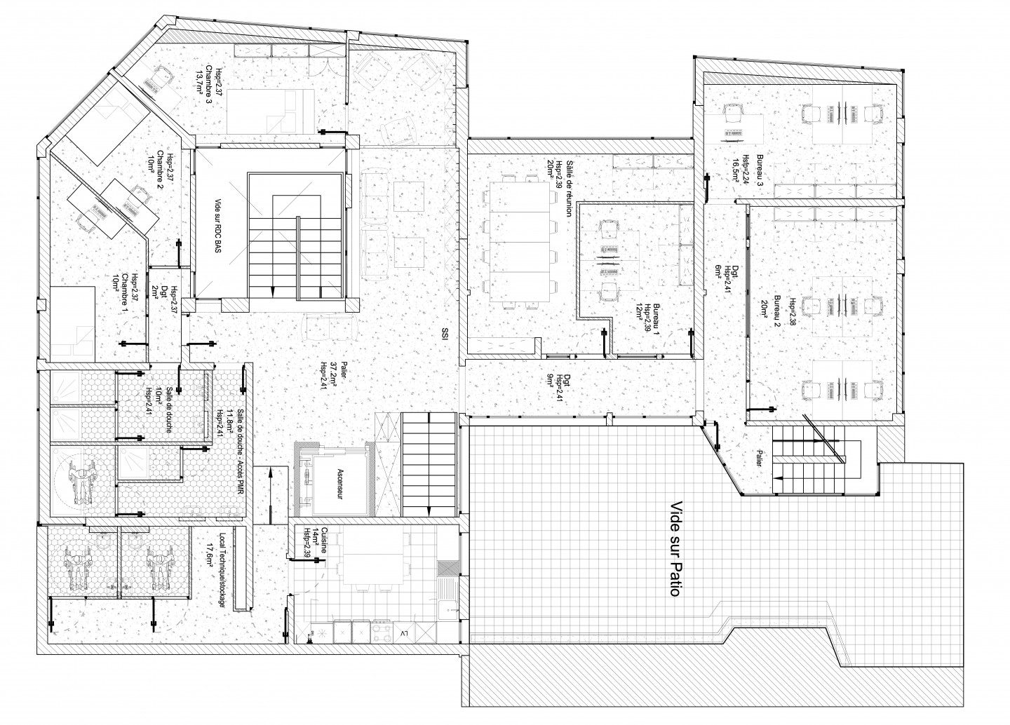 Le niveau R-2 est un espace particulier. Il est semi-enterré et est tourné vers un patio. À l’abri des regards, en toute discrétion, il est pourtant le noyau central de ce lieu artistique tourné vers le partage, la création et l’échange. Il est l’endroit où les rencontres se font, où les projets artistiques prennent vie.